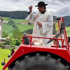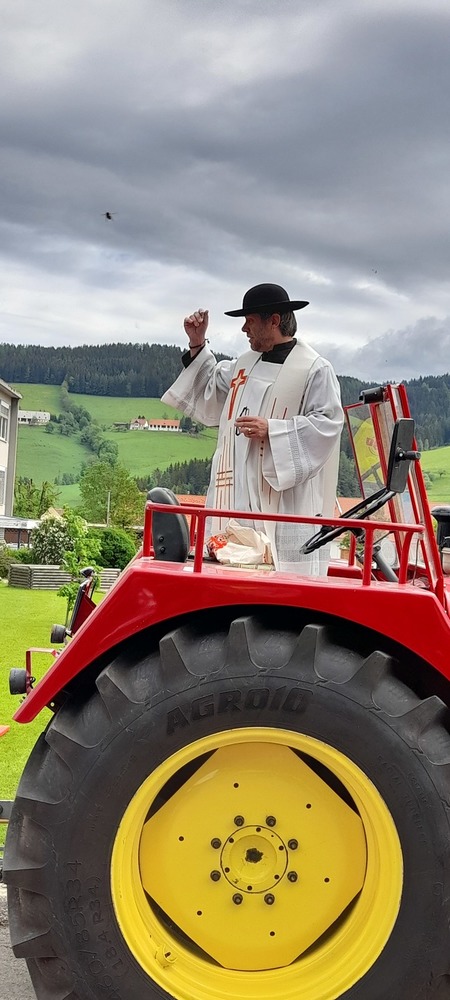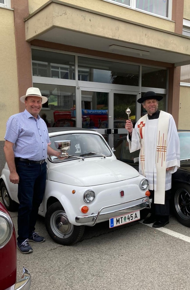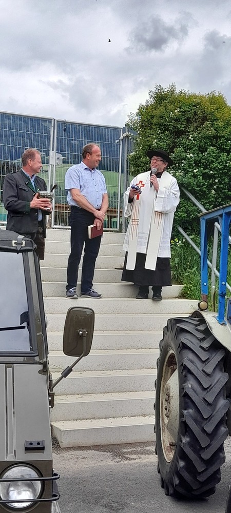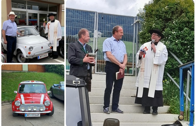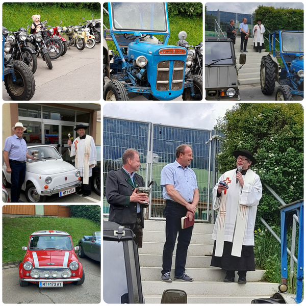 Pfarrer Mag. Heimo Schäfmann segnete nach dem Gottesdienst Oldtimer Autos, Traktore, Motorräder und Mopeds usw. Anschließend startete eine kleine Ausfahrt über Tirolerwirt, St. Georgen und zurück zum Ausgangspunkt des Schulzentrums Obdach.