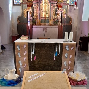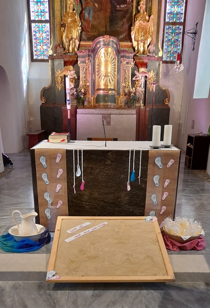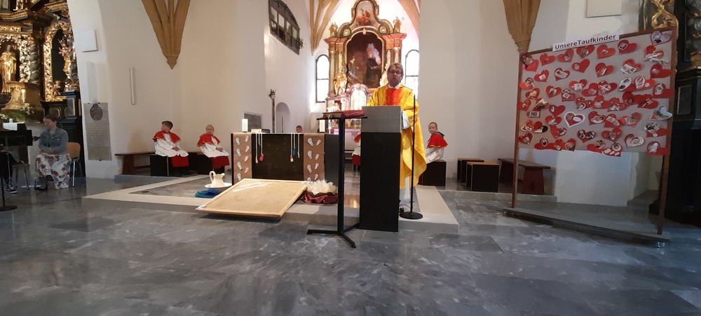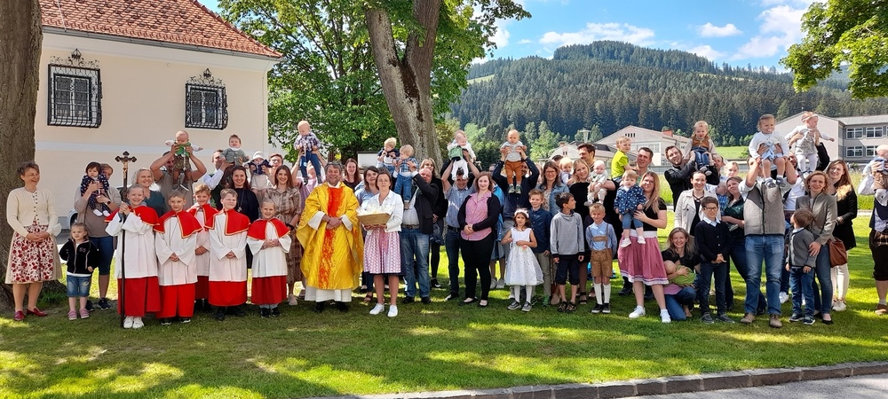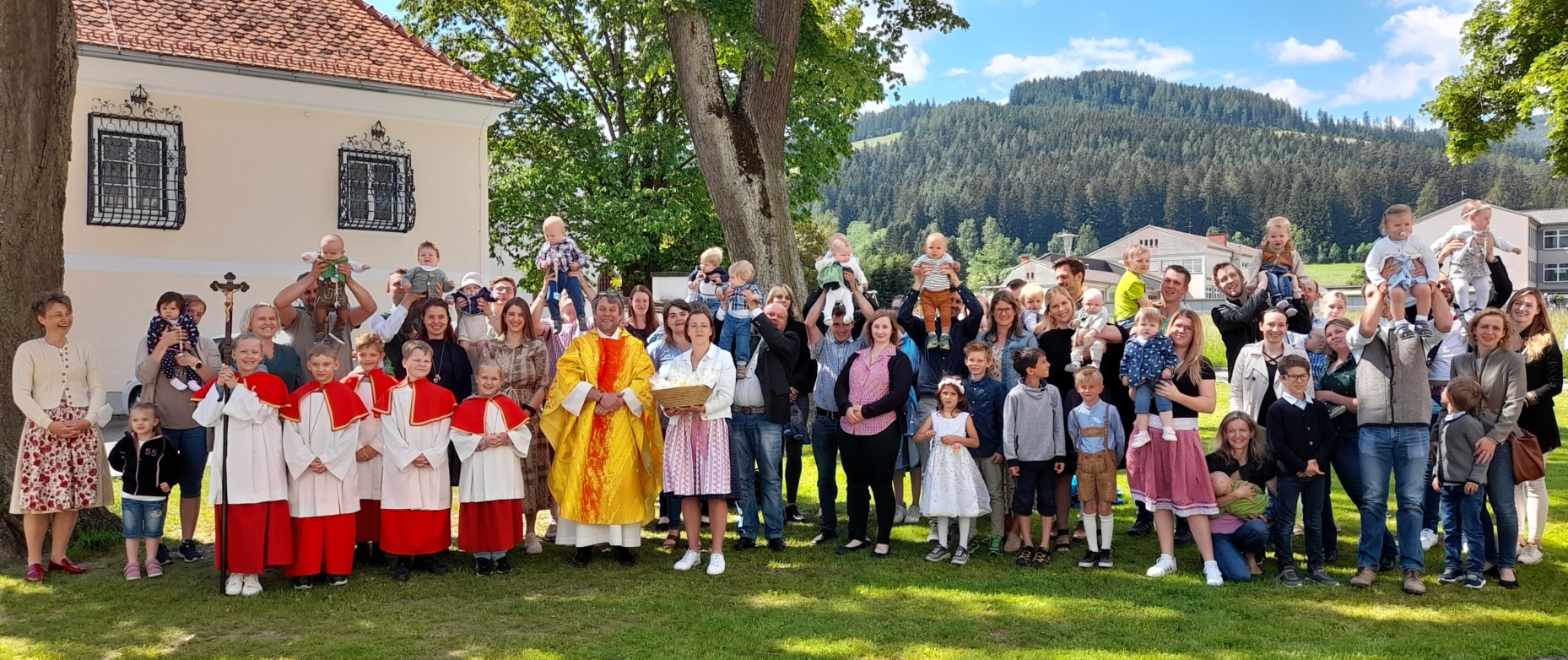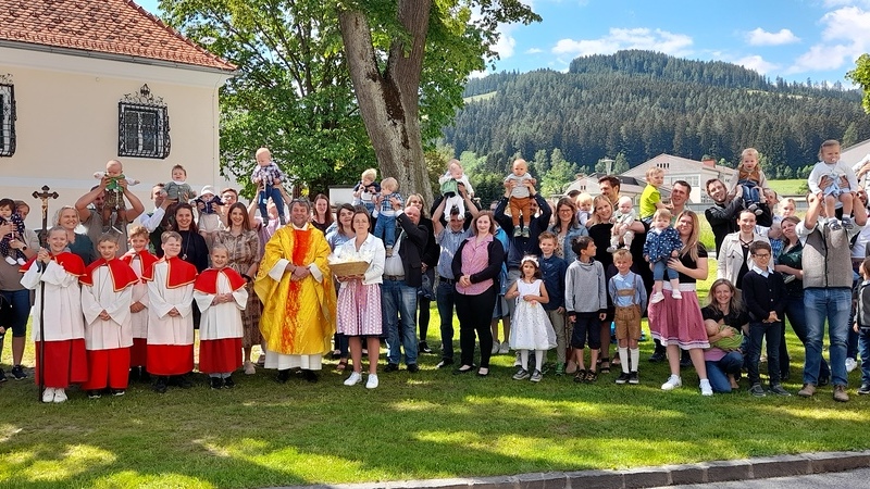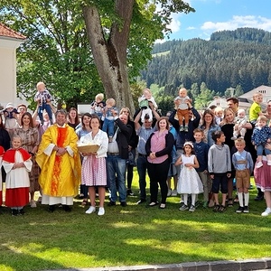 Pfarrer Mag. Heimo Schäfmann zelebrierte diesen besonderen Gottesdienst, er ging in der Predigt auf die Geschichte „Spuren im Sand“, wie Eltern, TaufpatInnen und Freunde BegleiterInnen im Erwachsenwerden eines Kindesspuren hinterlassen können, ein. Musikalisch umrahmt wurde die Feier von der Gruppe KlaungVui. Im Anschluss gab es für die Familien ein „Schutzengerl“ aus Wachs von der Pfarre.