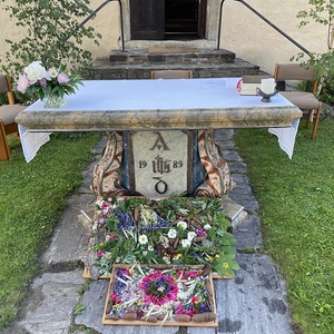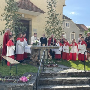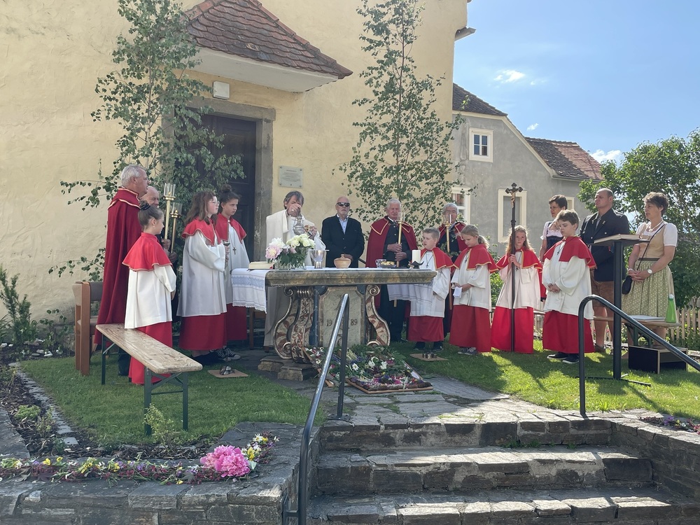 Pfarrer Mag. Heimo Schäfmann begrüßte die zahlreichen Mitfeiernden bei herrlichem Wetter unter freiem Himmel vor der Johannes-Kapelle.