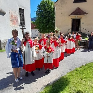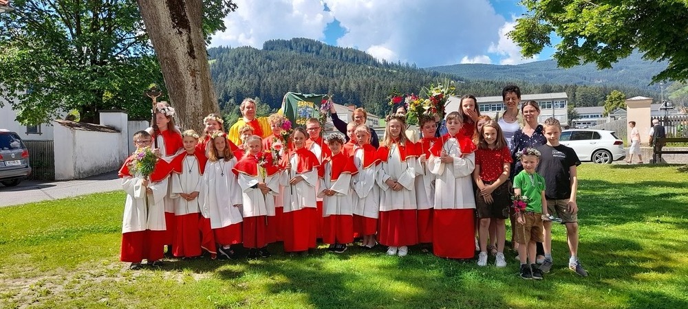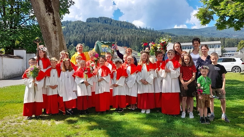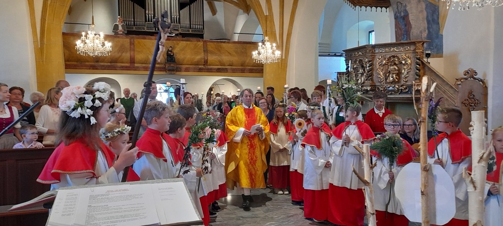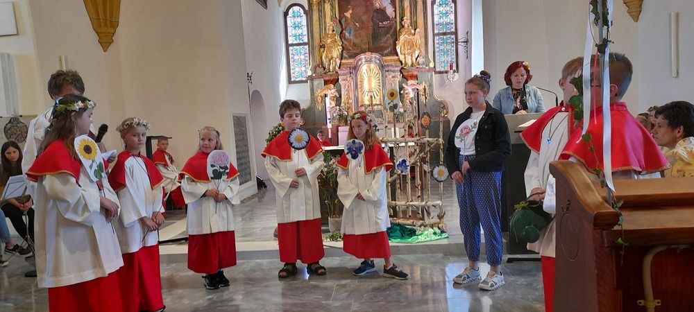 Die Eki`s, Minis, Jungschar und Mesner feierten heute ihren Abschlussgottesdienst in der Obdacher Pfarrkirche mit Heimo Schäfmann. Eine blumige Angelegenheit, zierten doch die Mädels Blumenkränzchen und die Buben Blumenstecken.