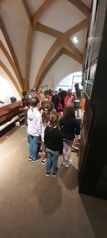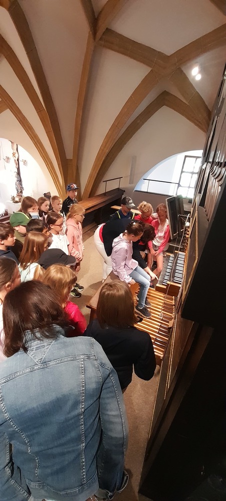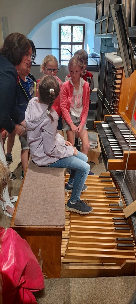 Die Kinder der zweiten und dritten Klasse Volksschule konnten ihren Religionsunterricht, für je eine Stunde, in die neurenovierte Kirche verlegen. Besichtigt und probiert wurde die Orgel, das größte Instrument, Frau Richter erklärte den Kindern wie so ein großes Instrument funktioniert. Frau Koini marschierte mit den Kindern auf den Kirchturm und erklärte die Glocken, deren Funktion und es wurde geschaut, wie diese früher ohne Strom funktionierten.