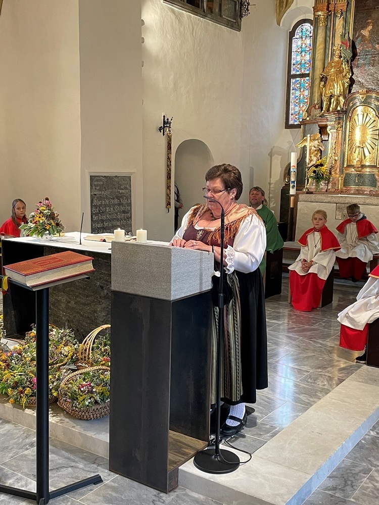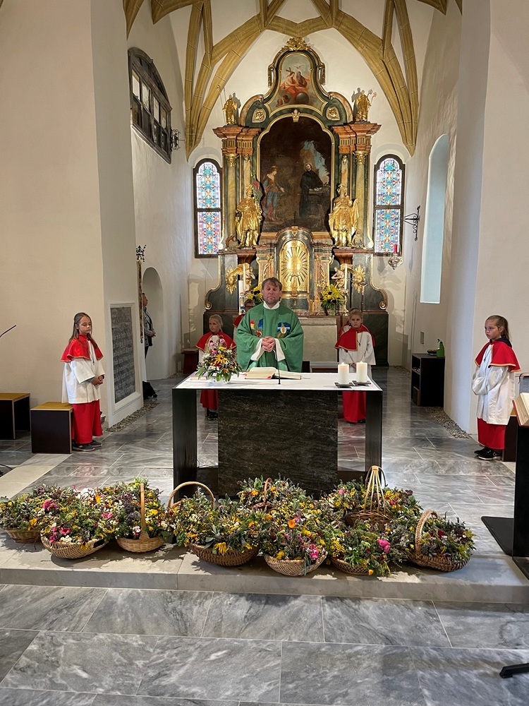 Obfrau Traude Kienberger, die den Verein seit mittlerweile fast 10 Jahren leitet, hatte mit ihren Mitgliedern wieder wunderbar duftende Kräutersträuße gebunden. Pfarrer Mag. Heimo Schäfmann ging in seiner Predigt auf Tracht und Tradition ein: