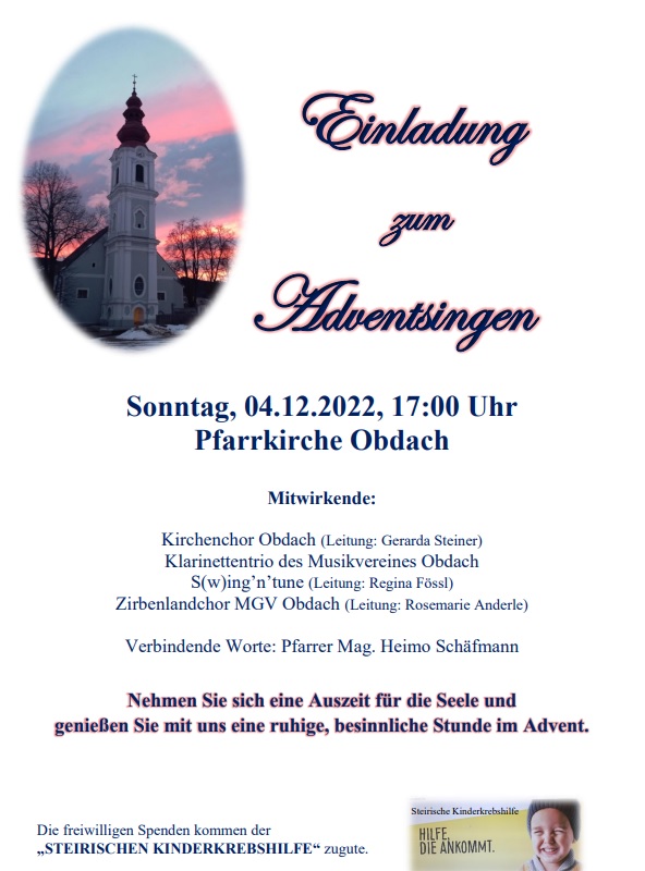 2.159,50 € wurden anlässlich des Adventsingens in der Pfarrkirche Obdach am 04.12.22 gesammelt und der Steirischen Kinderkrebshilfe gespendet.