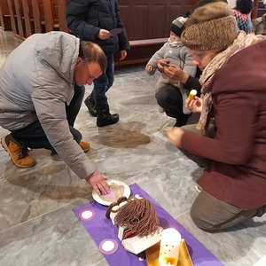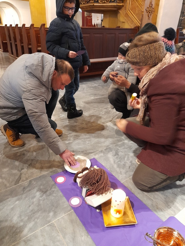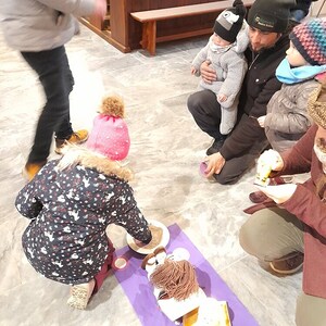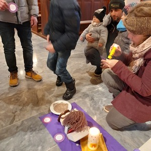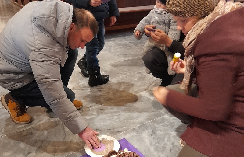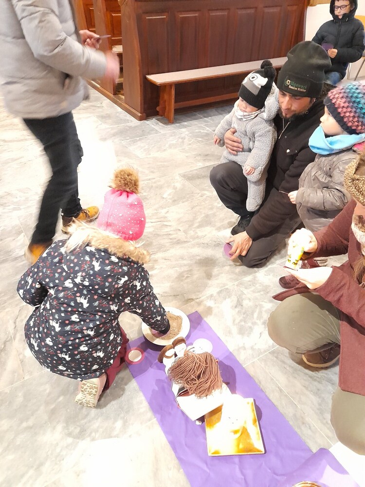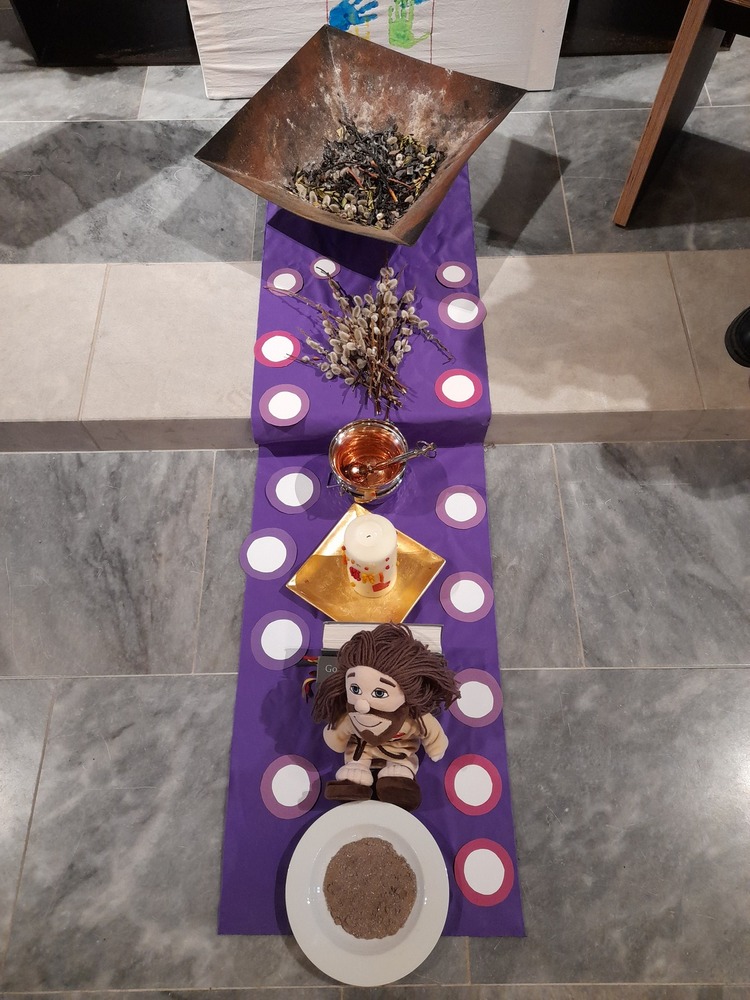 Past. MA Anni Koini begrüßt die Kinder mit der Jesuspuppe und zieht mit allen in die Kirche ein. Gemeinsam mit dem KLEKI Team feiern wir anschließend dem Anlass entsprechend den GD. Diesmal stand der Beginn der Fastenzeit mit dem Verbrennen der alten Palmzweige zu Asche und anschließend das Applizieren der Asche zu einem Kreuz auf einem vorbereiteten Kreis im Mittelpunkt. Dieses Aschenkreuz durften die Kinder anschließend an den gemeinsam gespendeten Segen mit nach Hause nehmen.
