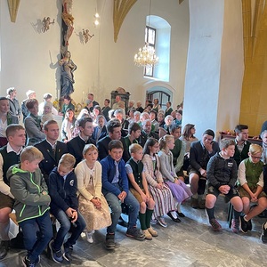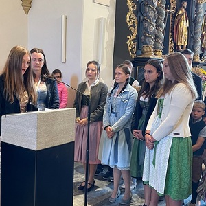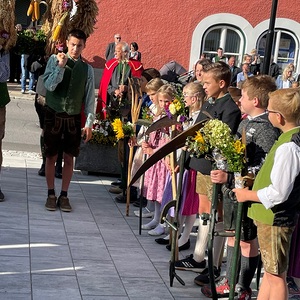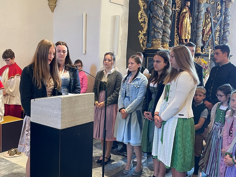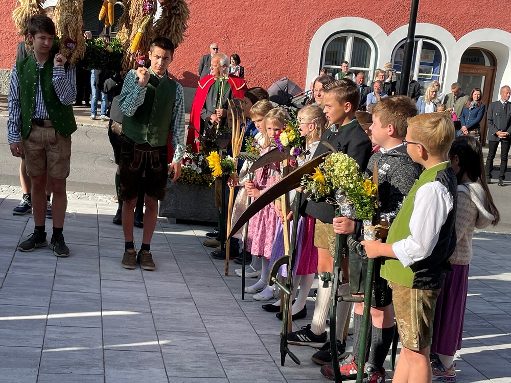 Die Schulkinder haben unter der Leitung ihrer Religionslehrerin Irmgard Mostögl die Werkzeuge des Bauernstandes geschmückt und getragen.