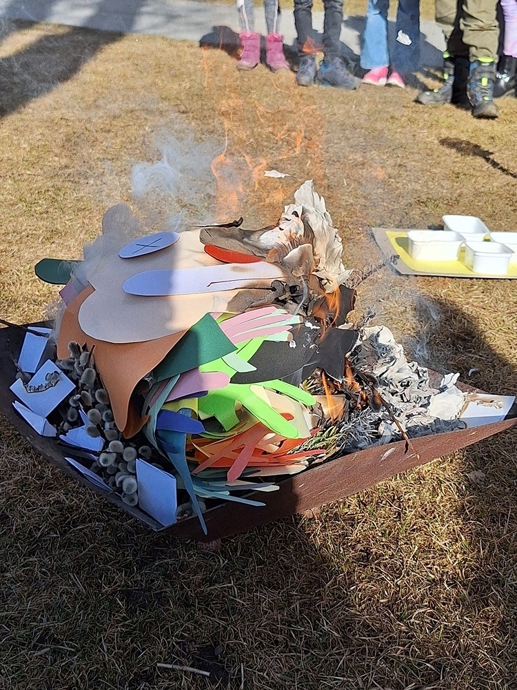 Am Aschermittwoch verbrannten die Erstkommunionkinder gemeinsam mit den Eki Kindern Faschingsschlangen, Reisig und alten Palmbuschen zu Asche.