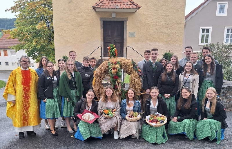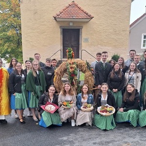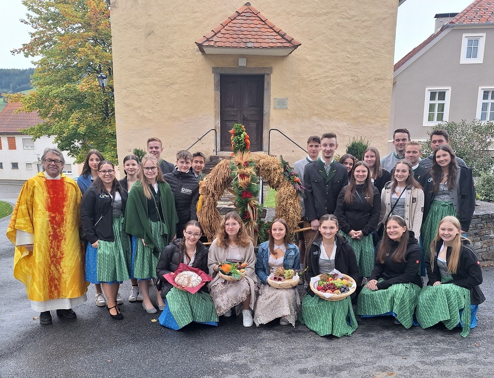 Landjugend mit Erntekrone und Gaben, Kinder der VS mit geschmückten Werkzeugen, BäuerInnen mit Lesung, Gabenprozession und Agape.