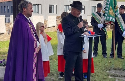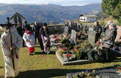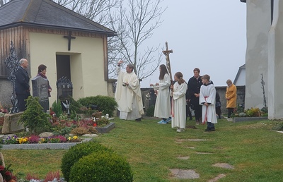 Die Gräber wurden vor der Messe von Pfarrer Ferdinand Sattler und den Ministranten mit Weihwasser und Weihrauch gesegnet.