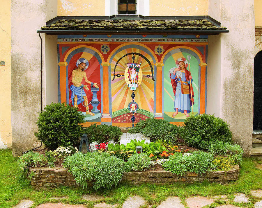 Im umliegenden Friedhof errinert an der Kirchennordseite eine schlichte Grabplatte sowie die Wandmalerei (Jesus als Guter Hirte und Schmerzensmann) des weststeirischen Künstlers Franz Weiss an den hier beigesetzten Märtyrerpriester Heinrich Dalla Rosa.