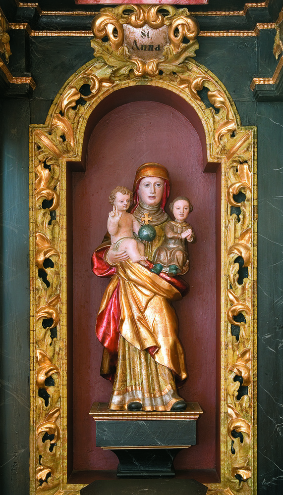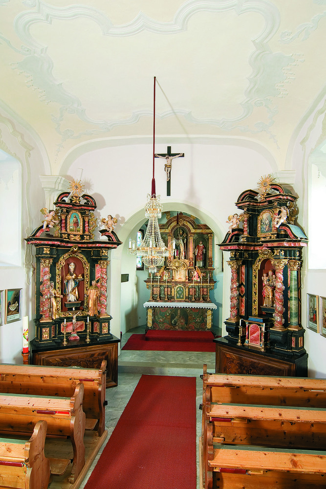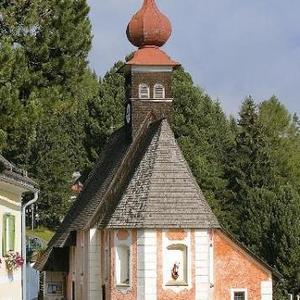 An die schmucke kleine Kirche mit dem gotischen, von Strebepfeilern umsäumten Chor und dem Dachreiter mit barockem Zwiebelhelm schließt im Westen des Friedhofs an. Am Friedhofszaun stehen vier kleine Initienkapellen (Initien=Anfänge der Evangelien, die hier als Bitte um Wettersegen und Fruchtbarkeit gesungen wurden); bemerkenswert ist auch der prächtige Zirbenbestand um Kirche und Pfarrhof.