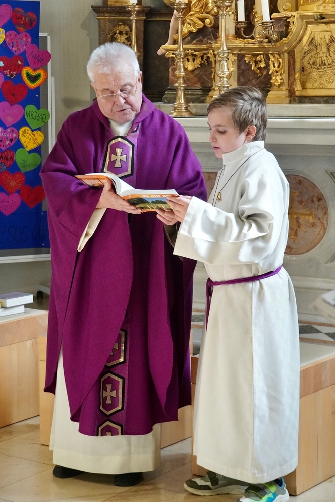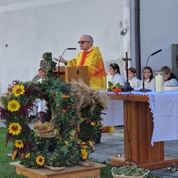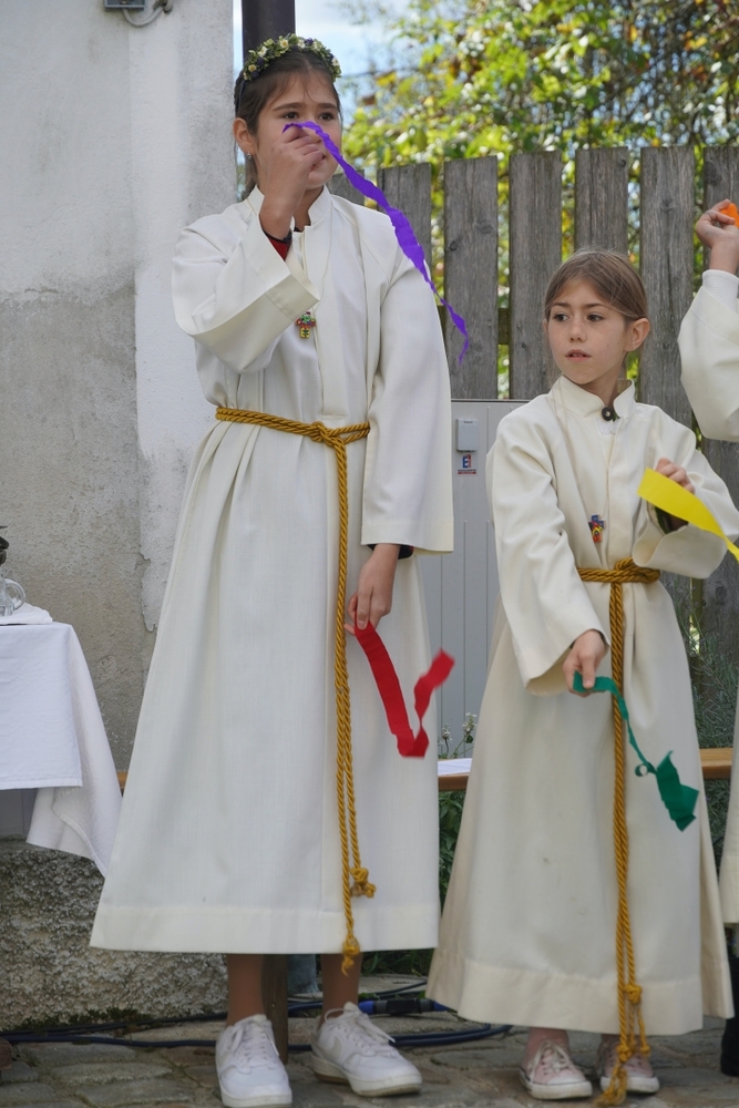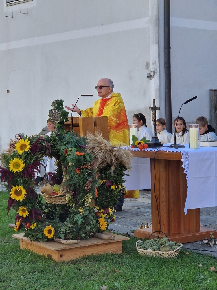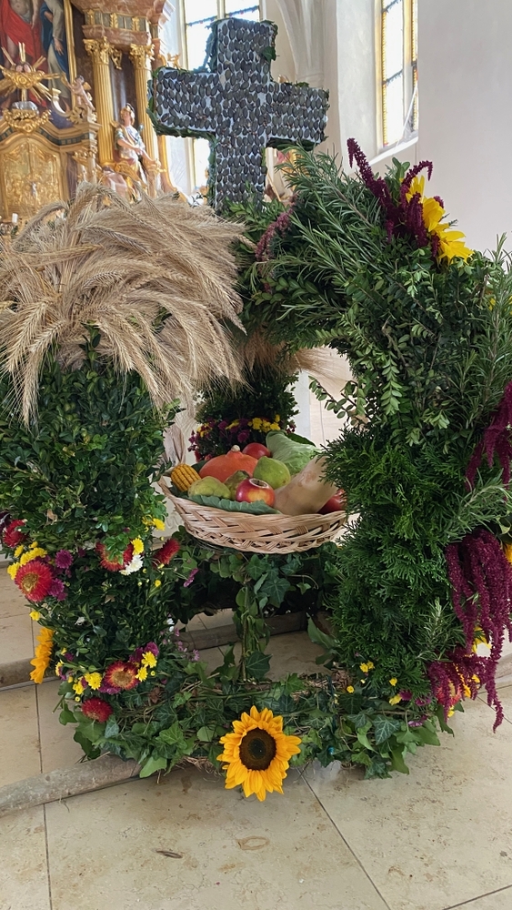 Voll Dankbarkeit und Freude feierten wir das diesjährige Erntedankfest in unserer mit großen und kleinen Leuten gut gefüllten Kirche. Vikar Norbert Glaser zelebrierte die heilige Messe, assistiert von Diakon Michi Zepf und sieben tüchtigen Minis.