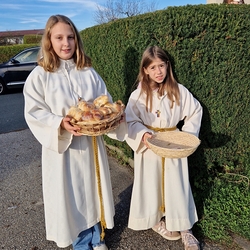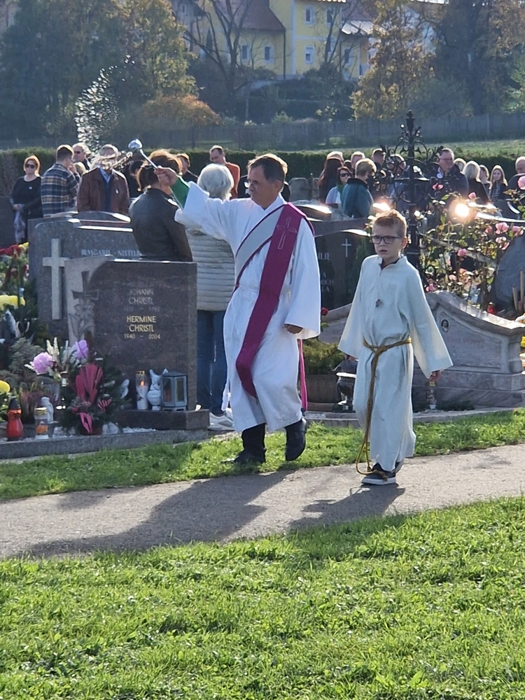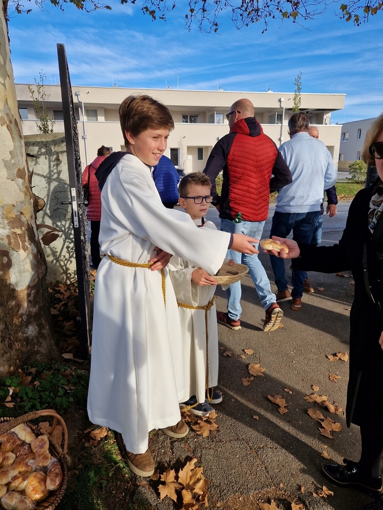 Zum Abschluss boten die bei der Feier fleißig assistierenden Minis an den Friedhof-Ausgängen gegen freiwillige Spende ihre am Vortag gebackenen Allerheiligenstriezerl an, die im Nu ausverkauft waren!