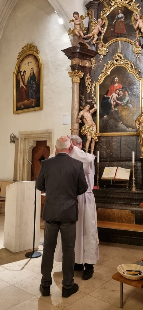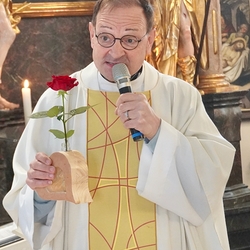 Vor dem Schlusssegen überreichte Ernst Pock im Namen der Pfarre dem neuen Diakon ein Aspergill, mit dem dieser gleich voll Freude die Gläubigen segnete. Für seine Ehefrau Eva, die ihm begleitend zur Seite steht, gab es einen Blumenstrauß, mit den besten Wünschen für sie.