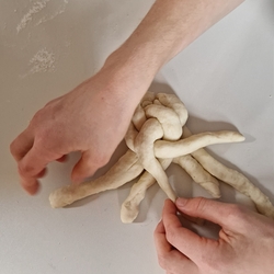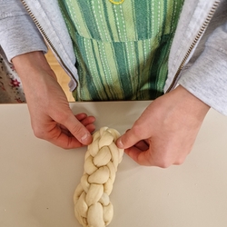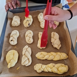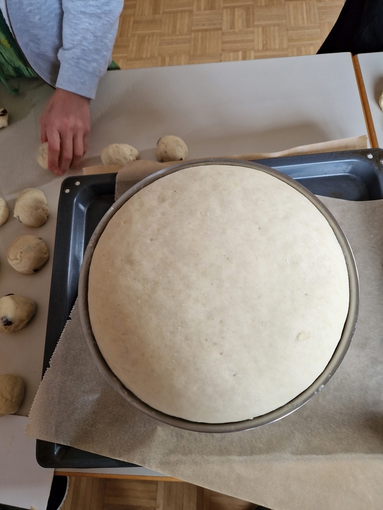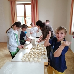 Am 31. Oktober fanden sich auch heuer wieder viele große und kleine Bäckerinnen und Bäcker im Pfarrheim ein, um aus 12 kg Germteig herrliche Allerheiligenstriezerl zu formen. Sieben Erwachsene sowie alle Minis und eventuell zukünftige Minis (insgesamt 16 Kinder) waren von 9 -11 Uhr mit Feuereifer dabei.
