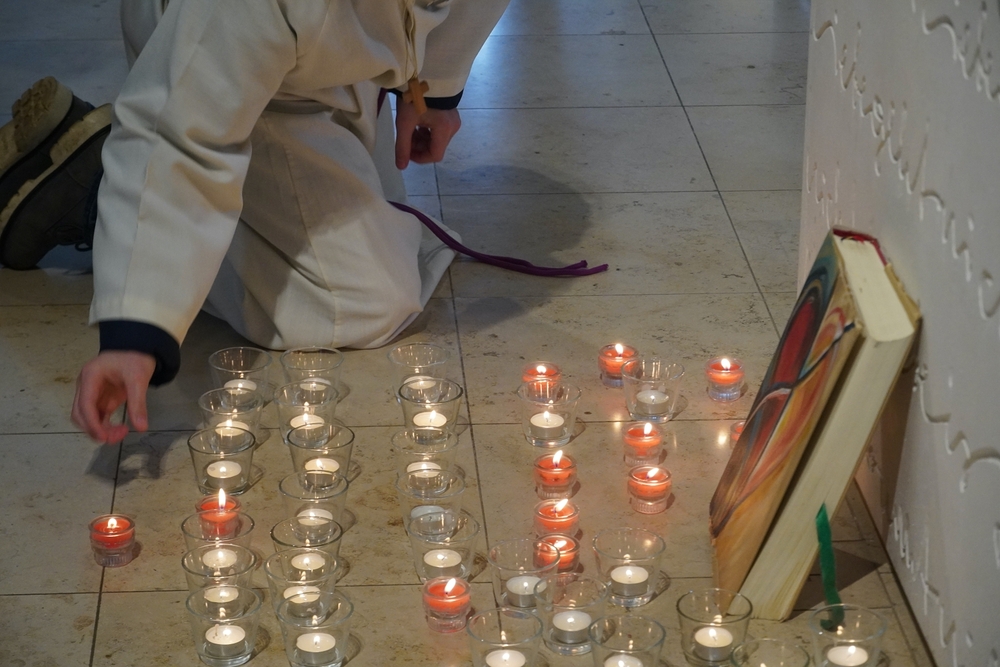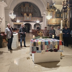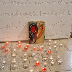 Vor dem Altar brannten 59 Teelichter für alle Menschen, die im letzten Jahr in unserer Pfarre verstorben sind. Ihre Namen wurden noch einmal laut ausgesprochen. Ein Teelicht leuchtete für alle Verstorbenen, die ungenannt blieben.