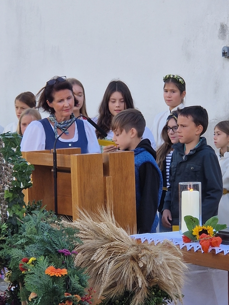 Von der schwungvollen Musik unserer Musikgruppe begeistert, sangen wirklich alle gerne mit, vom Kirchenchor bis zu den VS-Kindern, deren besonderer Erntedankschmuck übrigens nun die Empore im Altarraum ziert.