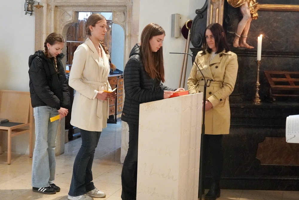 Gute Gedanken der MS-Schüler*innen regten beim Kyrie zum Nachdenken an – ein leerer Korb, der „Gott, sei Dank“ nicht leer bleibt! Ihre Fürbitten kamen aus eigener Feder und von Herzen.