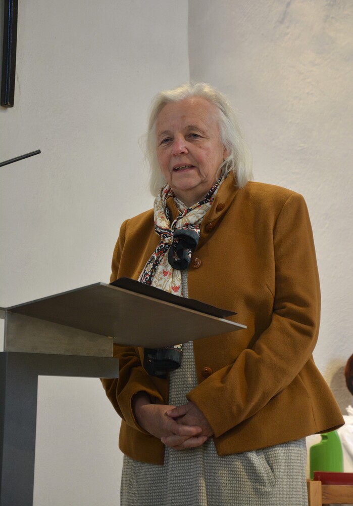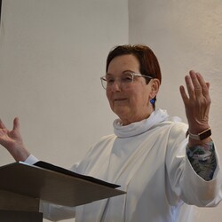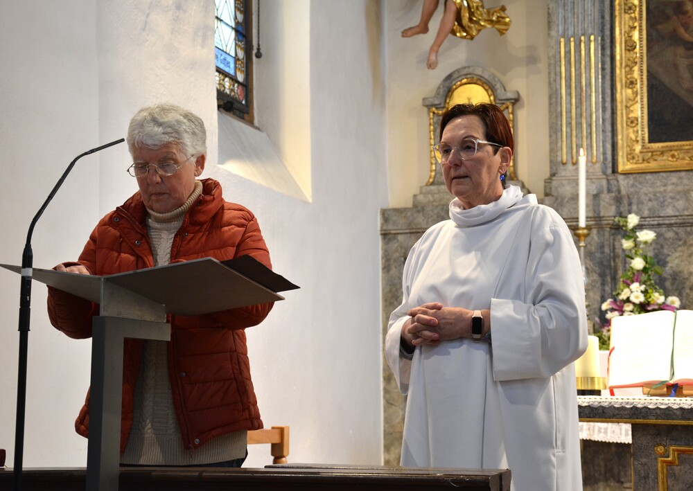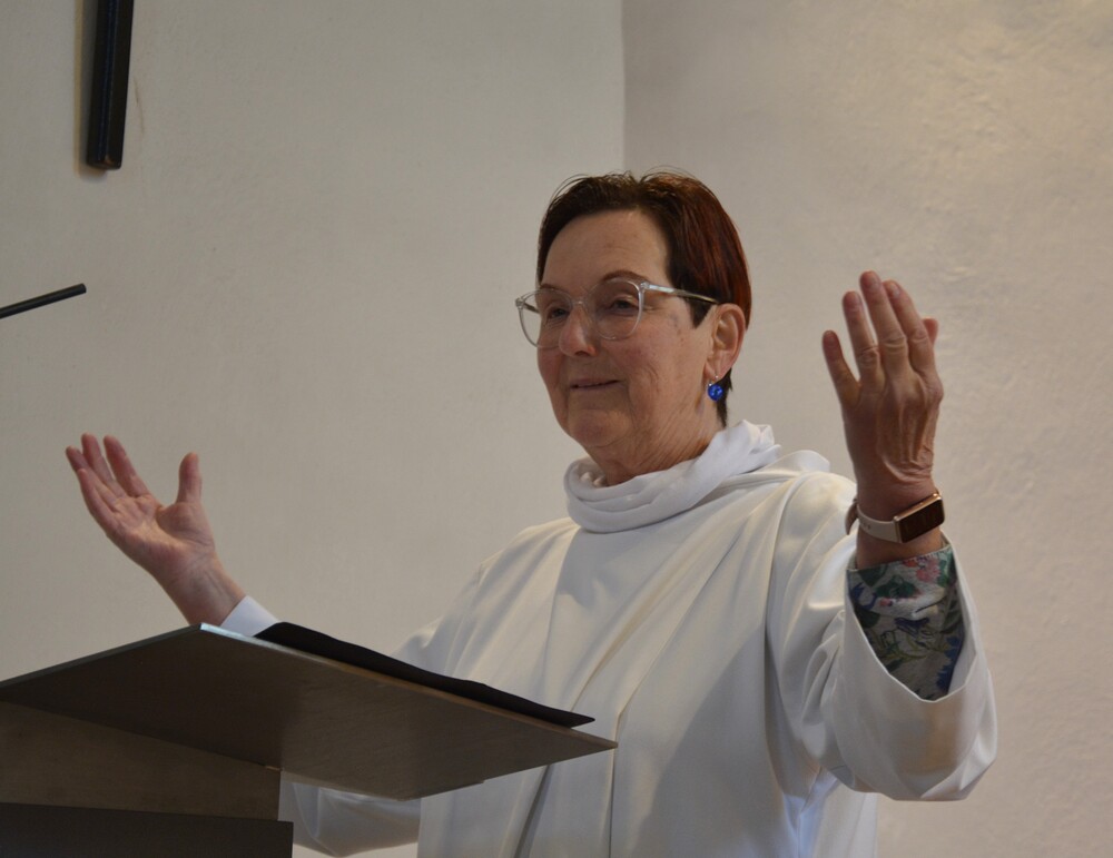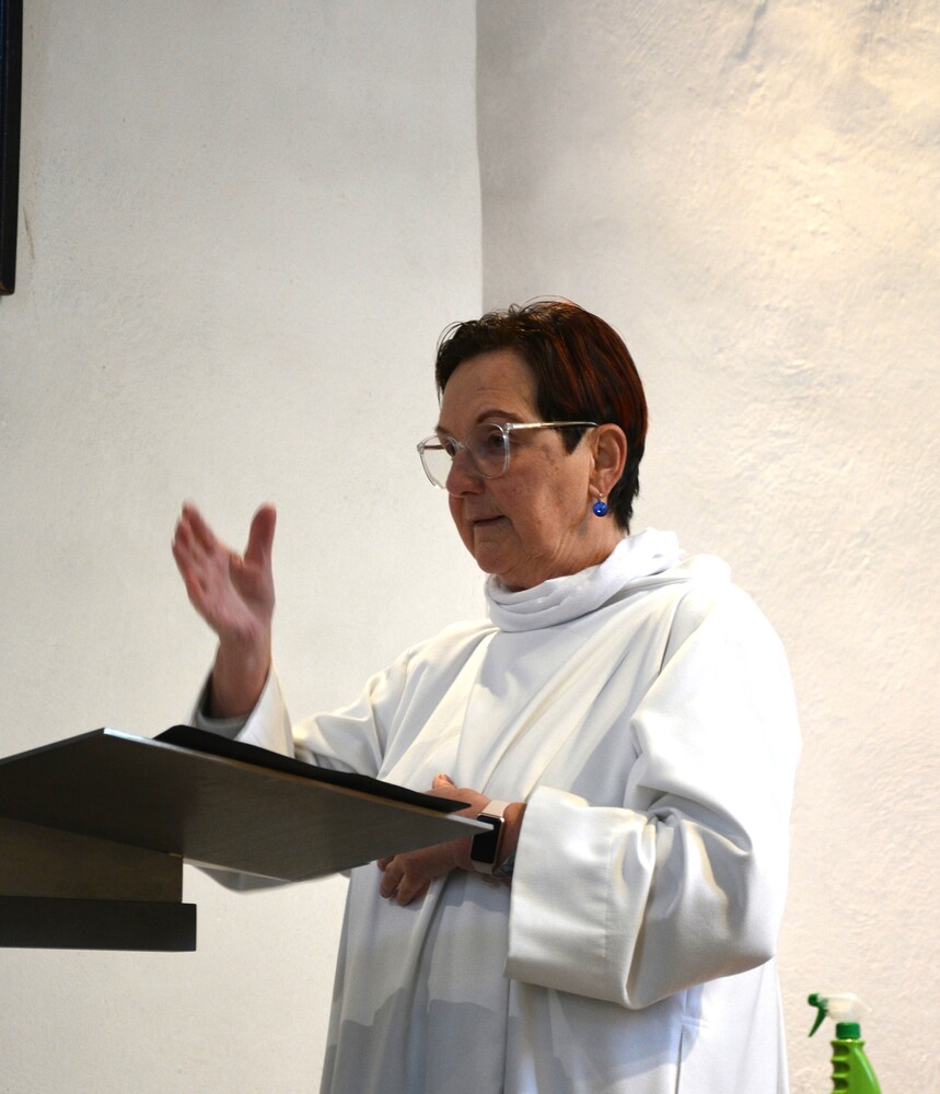 Susanne Linhardt leitet die Wort-Gottes-Feier und Vernissage zur Ausstellung von Haxhi Fejzullahi