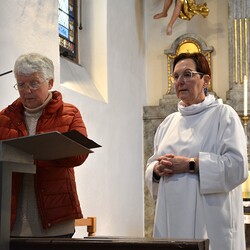 Am Sonntag des guten Hirten lädt Susanne Linhardt ein zu überlegen, worin unsere Zeugenschaft besteht. In welchem der zentralen Bezüge „Glaubensweitergabe, Gottesdienst oder Nächstenliebe“ sind wir einander ein Vorbild? Vor dem Pfarrcafè gab es die Vernissage zur Ausstellung von Haxhi Fejzullahi. Mag. Ingeborg Pock, Kunstpädagogin, Künstlerin und Mitglied der Gruppe 77, würdigte das Werk des Malers. Die Bilder beeindrucken durch die Mischung des verwendeten Materials und berühren durch Wahl und Gestaltung der Motive. Die Ausstellung kann bis 20. Juni 2023 nach jedem Gottesdienst besichtigt werden; Sondertermine auch nach Vereinbarung. Margret Hofmann, Pastorales Pfarrteam Liturgie und Öffentlichkeitsarbeit