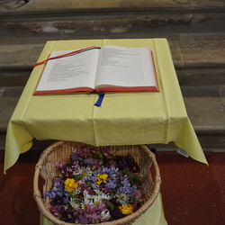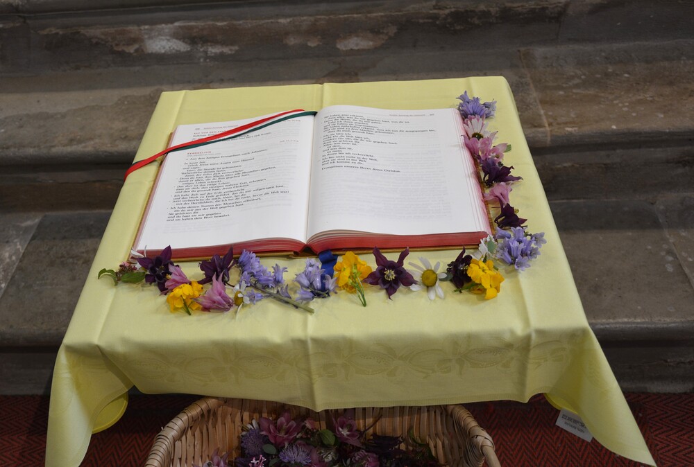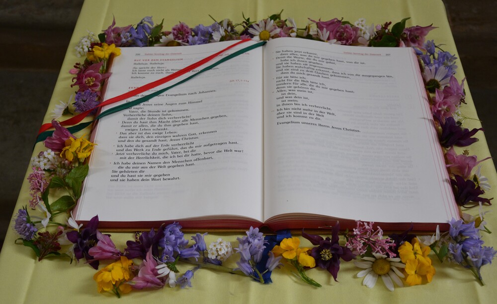 Nach Christi Himmelfahrt bleiben die Jünger und auch wir nicht verlassen zurück. Wir erfahren Jesu Nähe, wenn wir uns in seinem Namen versammeln und auf sein Wort hören. Zur Verehrung des Wort Gottes haben wir heute Blumen um das Evangeliar gestreut. Margret Hofmann, Pastorales Pfarrteam Liturgie und Öffentlichkeitsarbeit