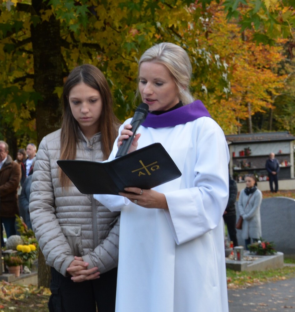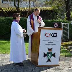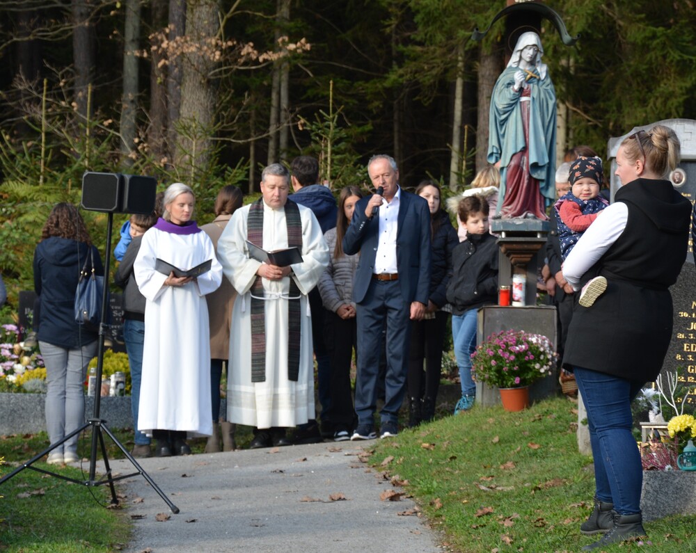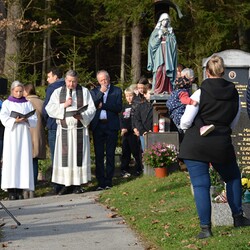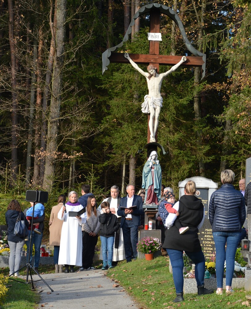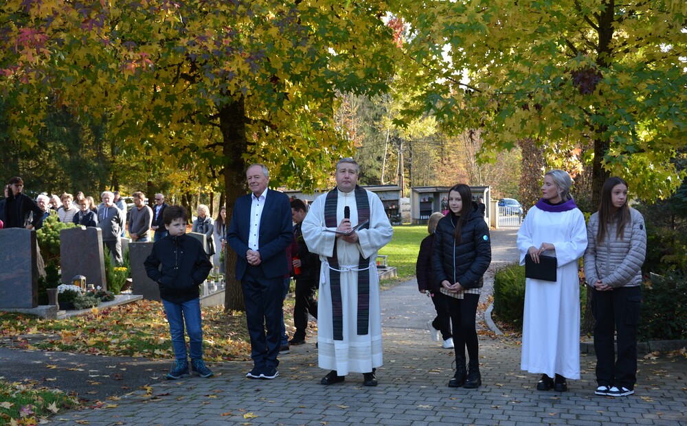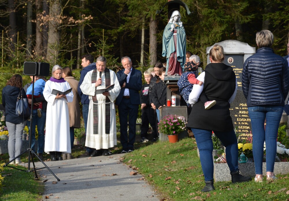 Beim Kriegerdenkmal gedachte der ÖKB mit der Pfarrgemeinde der Opfer beider Weltkriege. Am Waldfriedhof segneten Pfarrer Claudiu Budău mit Pastoralreferentin Ines Kvar und Krankenhausseelsorger Franz Karner die Gräber und die renovierte Aufbahrungshalle. Margret Hofmann, Pastorales Pfarrteam Liturgie und Öffentlichkeitsarbeit
