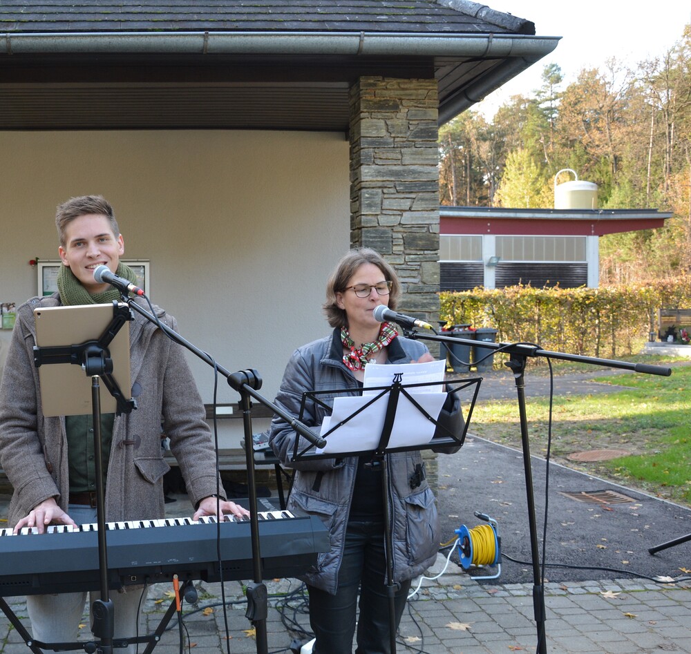 Pastoralreferentin Ines Kvar und Lena Krenn bei der Gräbersegnung am Waldfriedhof