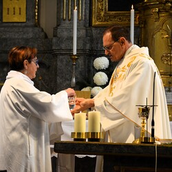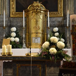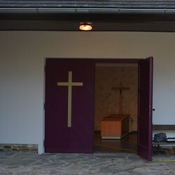Diesen gerissenen Vorhang können wir als Bild nehmen für die Auferstehung Jesu mit seinen Worten: „Im Hause meines Vaters gibt es viele Wohnungen.“ Durch ihn ist dieser Vorhang auf eine Hoffnung hin durchsichtig geworden, dass unsere Verstorbenen, wie er zum ewigen Leben erweckt werden, hinein in eine Welt ohne Trauer und Schmerz, wie es in der folgenden Lesung beschrieben wird. Offenbarung Und ich hörte eine große Stimme von dem Stuhl, die sprach: Siehe da, die Hütte Gottes bei den Menschen! Und er wird bei ihnen wohnen, und sie werden sein Volk sein, und er selbst, Gott mit ihnen, wird ihr Gott sein; und Gott wird abwischen alle Tränen von ihren Augen, und der Tod wird nicht mehr sein, noch Leid noch Geschrei noch Schmerz wird mehr sein; denn das Erste ist vergangen.Und der auf dem Stuhl saß, sprach: Siehe, ich mache alles neu.