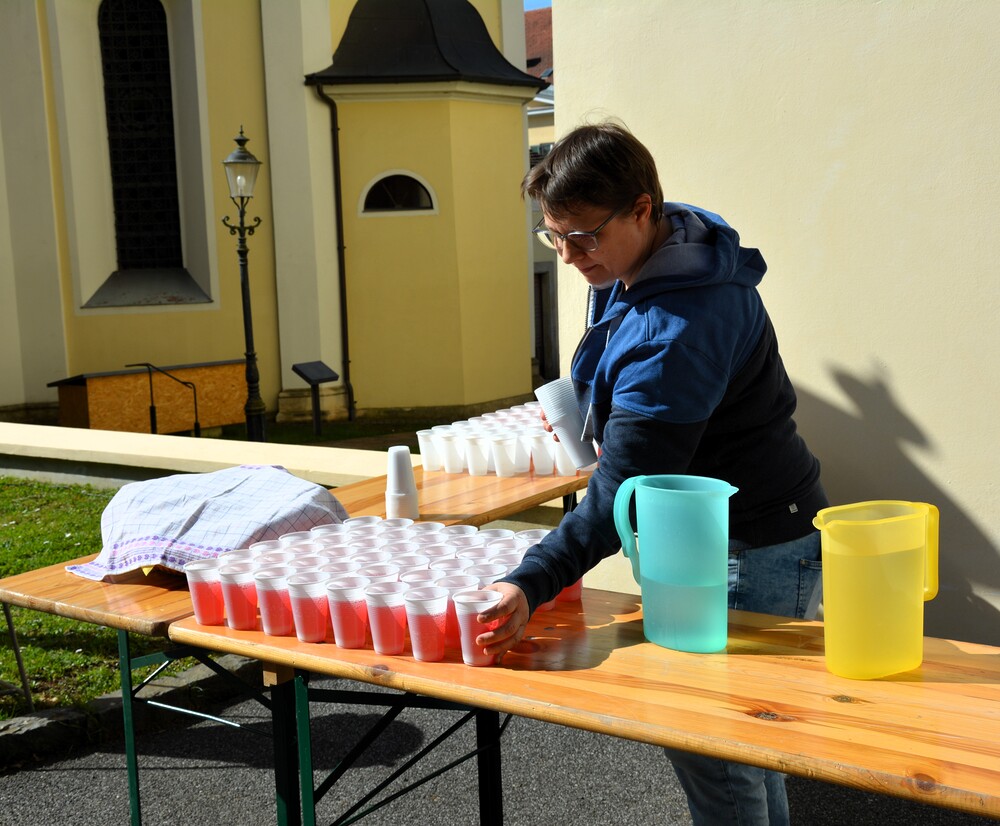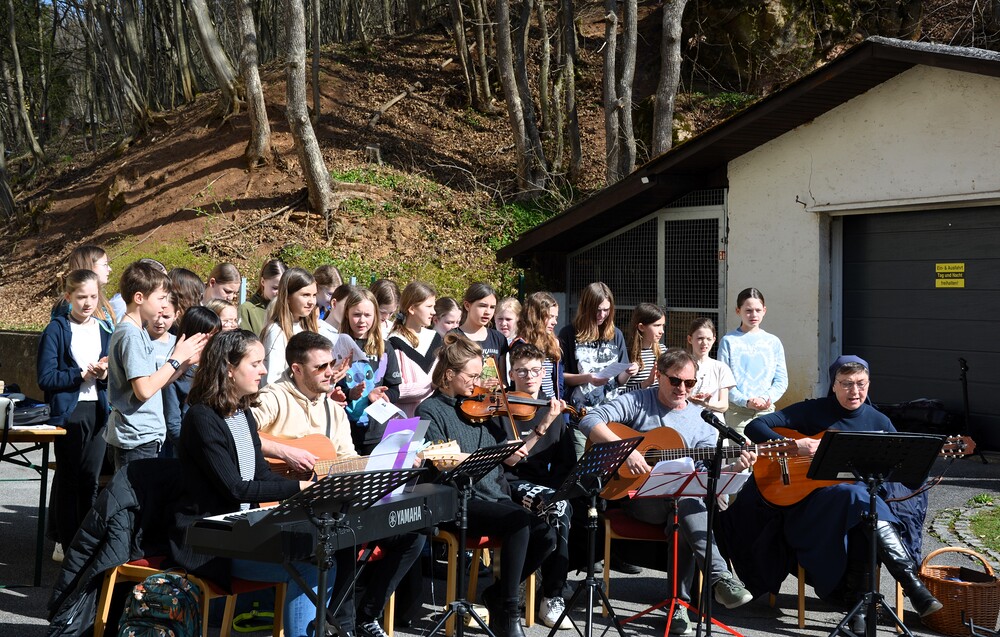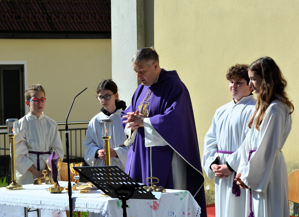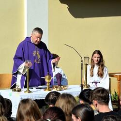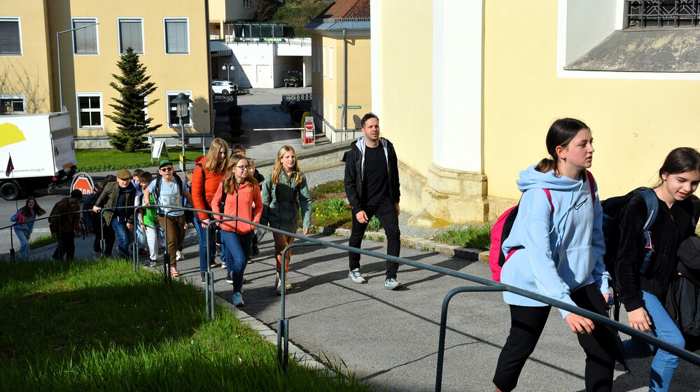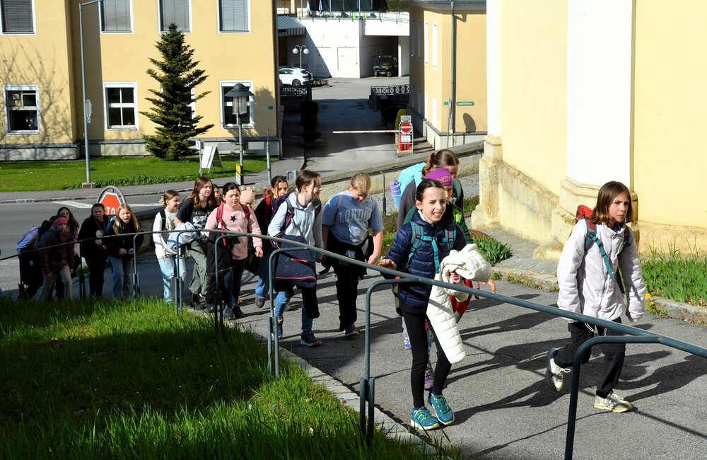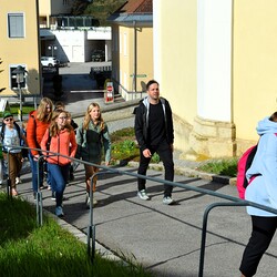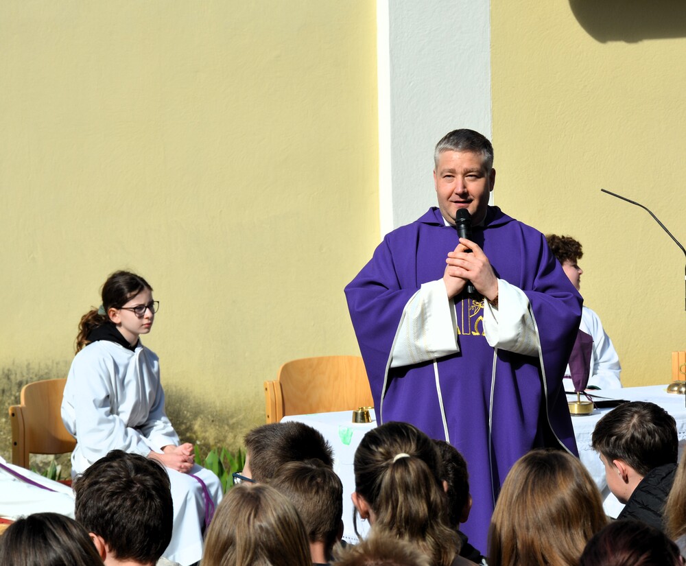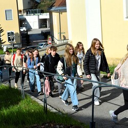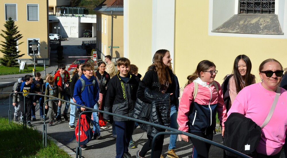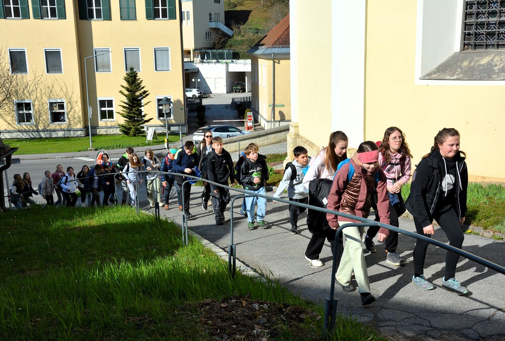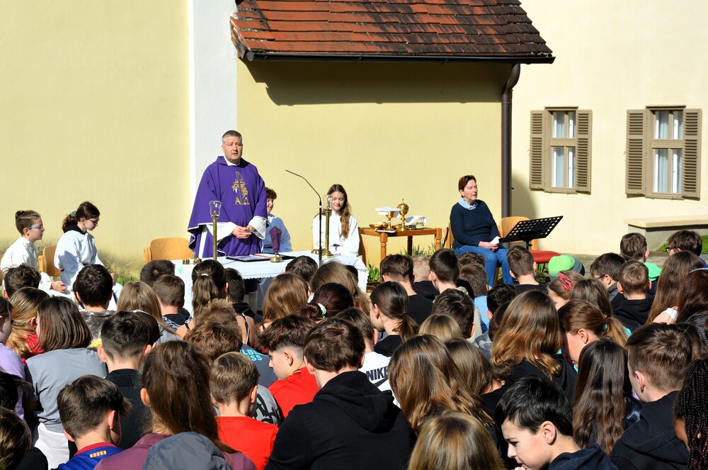 Traditionelle Fuß-Wallfahrt der PMS Dobl unter der neuen Leitung von Direktor Michael Rauch zur Kirche nach Tobelbad. Pfarrer Claudiu Budău feierte mit 360 Kindern und Lehrer:innen die Hl. Messe. Flotte Lieder waren vom Schulchor mit Gitarren- und Geigenbegleitung unter der Leitung von Sr. Maria Leopold zu hören. Als Agape gab es Saft und Brot für die Kinder, die vom Tobelbader Bewirtungsteam ein großes Lob bekommen. Sie waren diszipliniert, freundlich und aufmerksam!