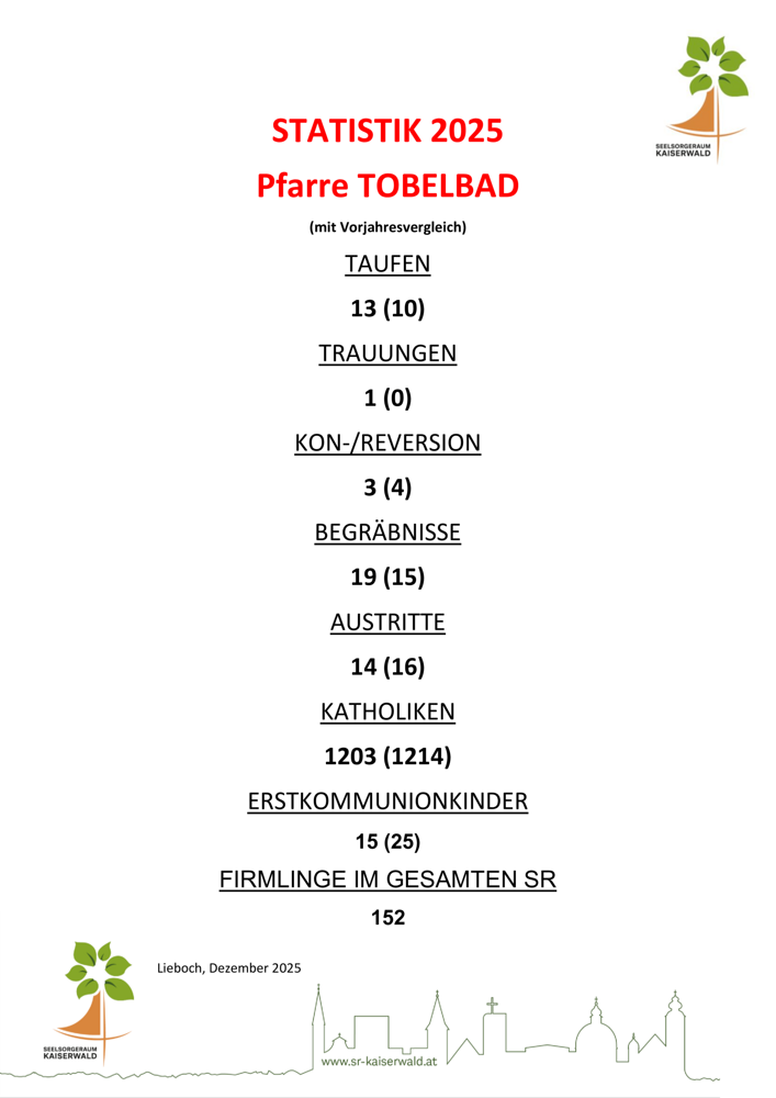 Die Jahresstatistik der Pfarre Tobelbad 2025 (Taufen, Trauungen, Begräbnisse etc.) finden Sie als Bild in der Galerie an letzter Stelle.