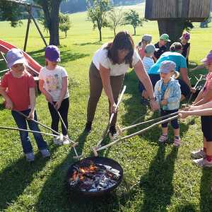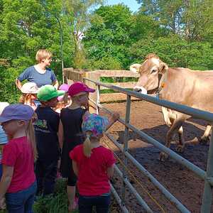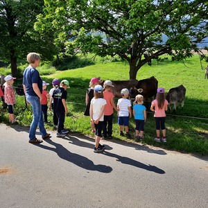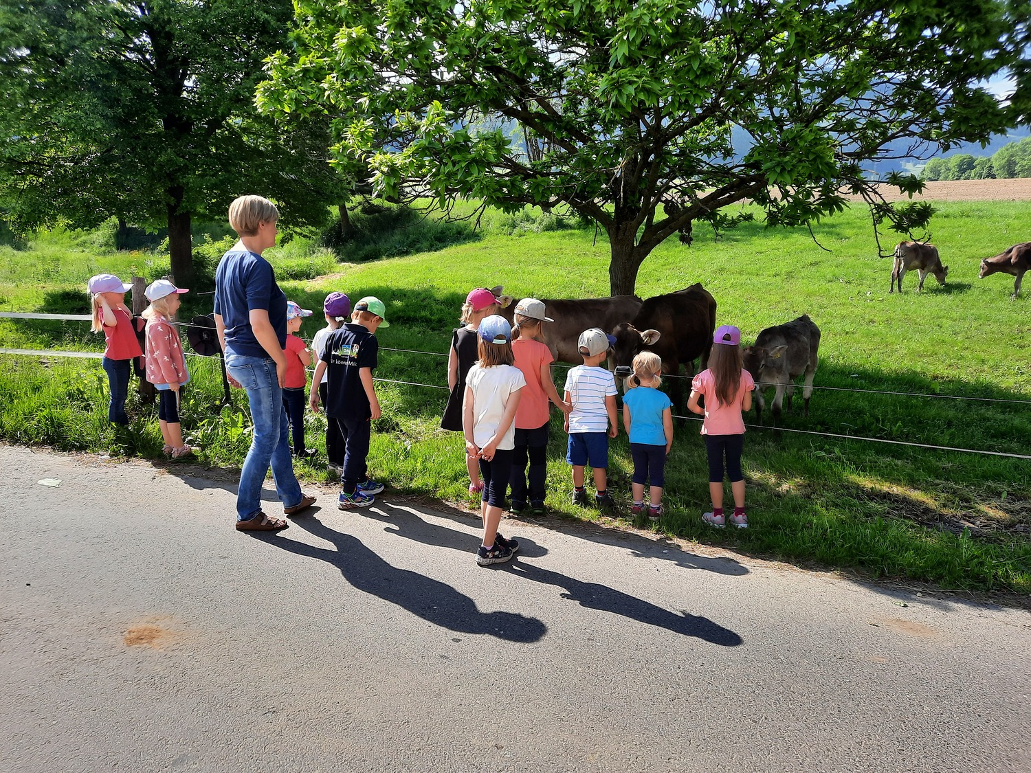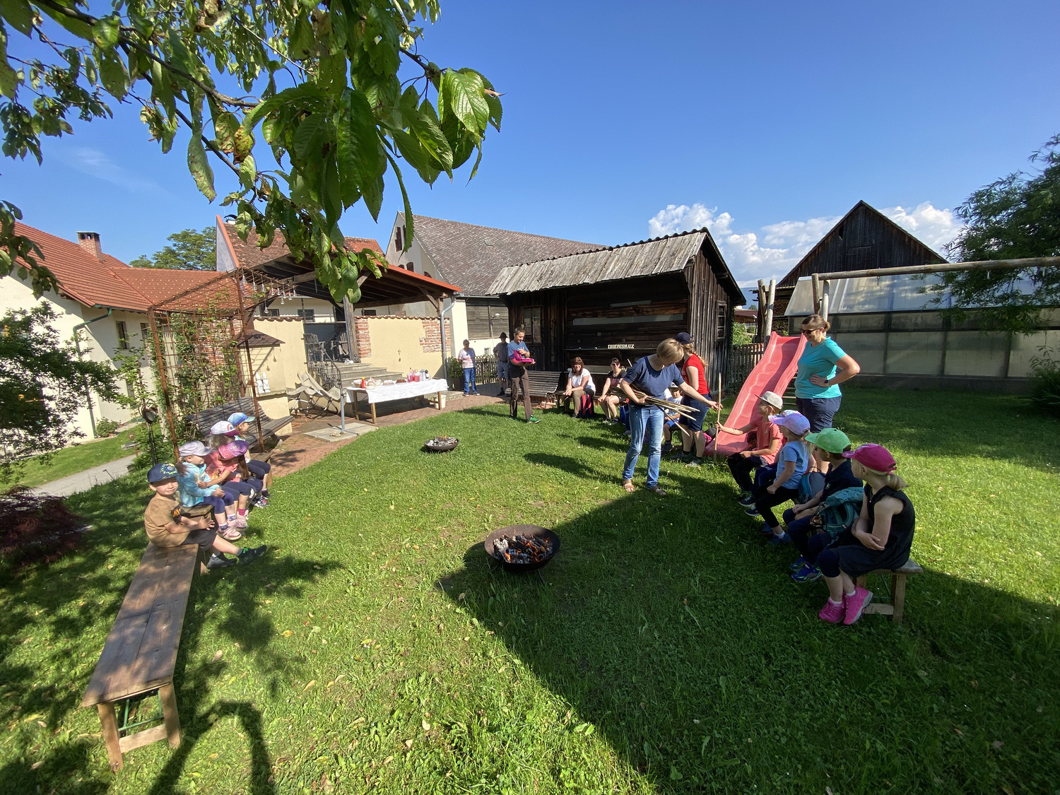 Nach einer Stärkung mit über der Feuerschale gegrillten Würsteln, Kuchen und erfrischenden Getränken besuchten die Kinder voller Freude die Tiere im Stall. Die Kinder fanden es lustig, dass ihnen die Kühe und Kälber mit ihrer rauen Zunge über die Hände schleckten. Nach unzähligen Streicheleinheiten machten wir uns auf den Weg in den Wald.