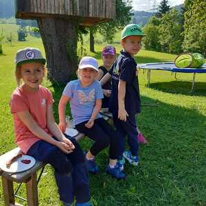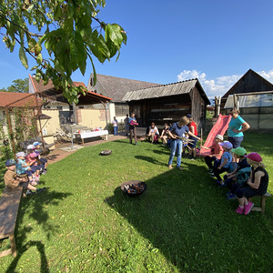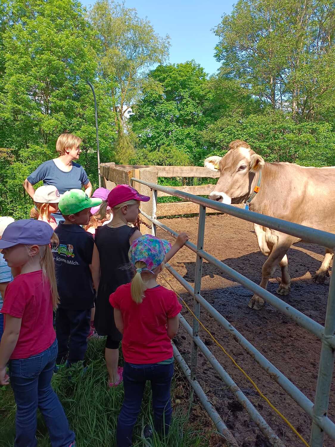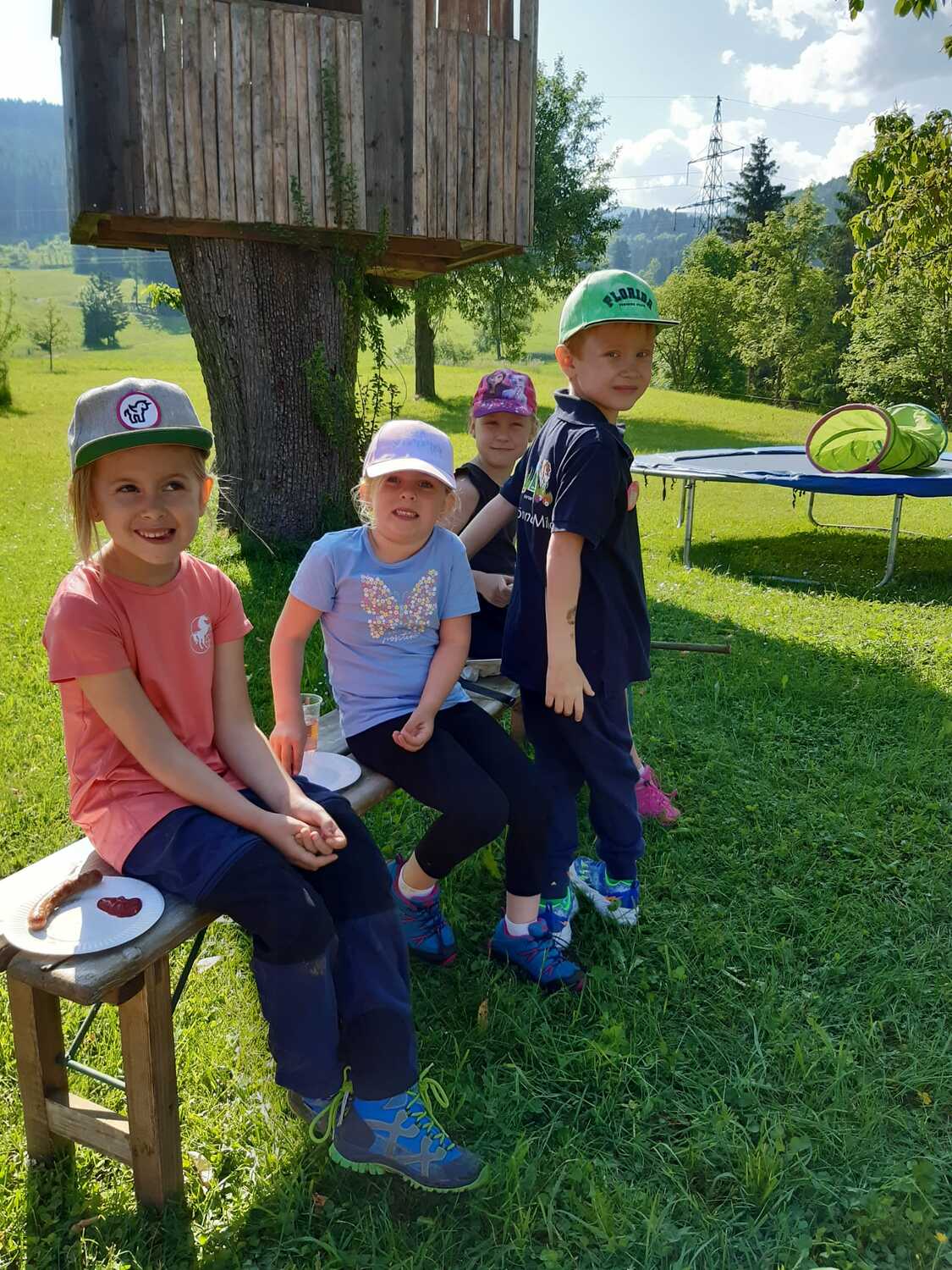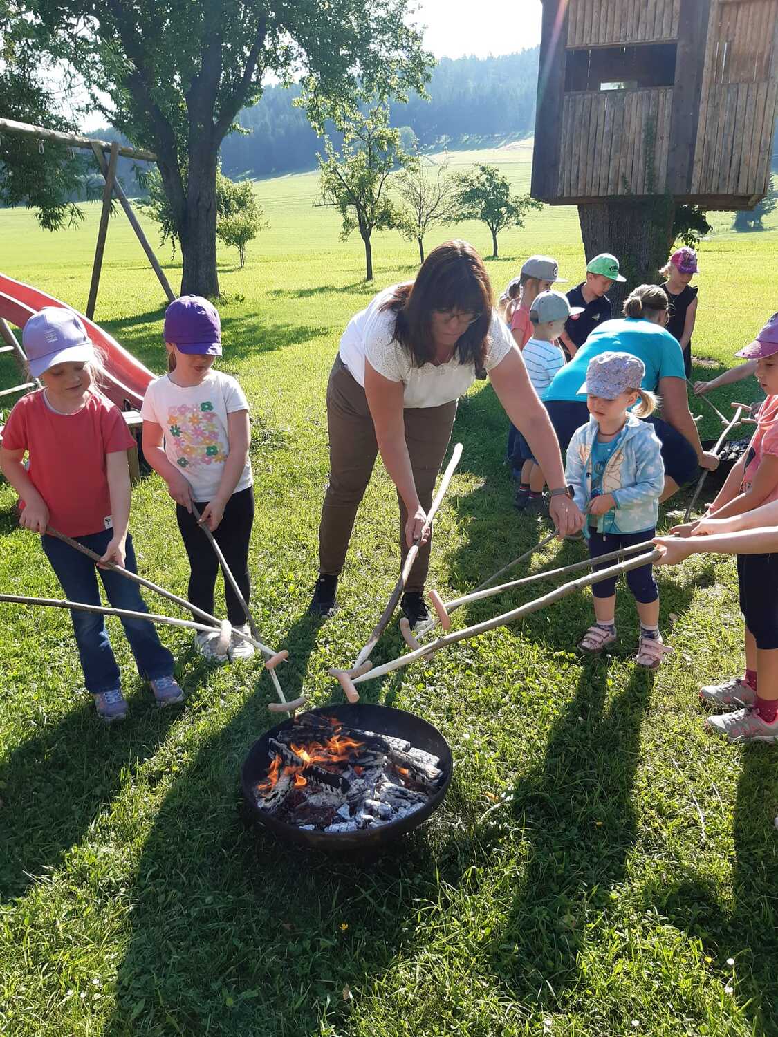 Nach einer Stärkung mit über der Feuerschale gegrillten Würsteln, Kuchen und erfrischenden Getränken besuchten die Kinder voller Freude die Tiere im Stall. Die Kinder fanden es lustig, dass ihnen die Kühe und Kälber mit ihrer rauen Zunge über die Hände schleckten. Nach unzähligen Streicheleinheiten machten wir uns auf den Weg in den Wald.