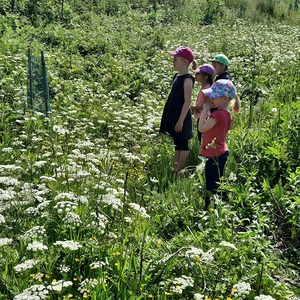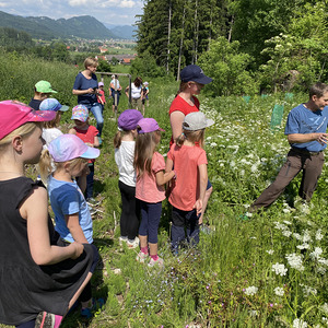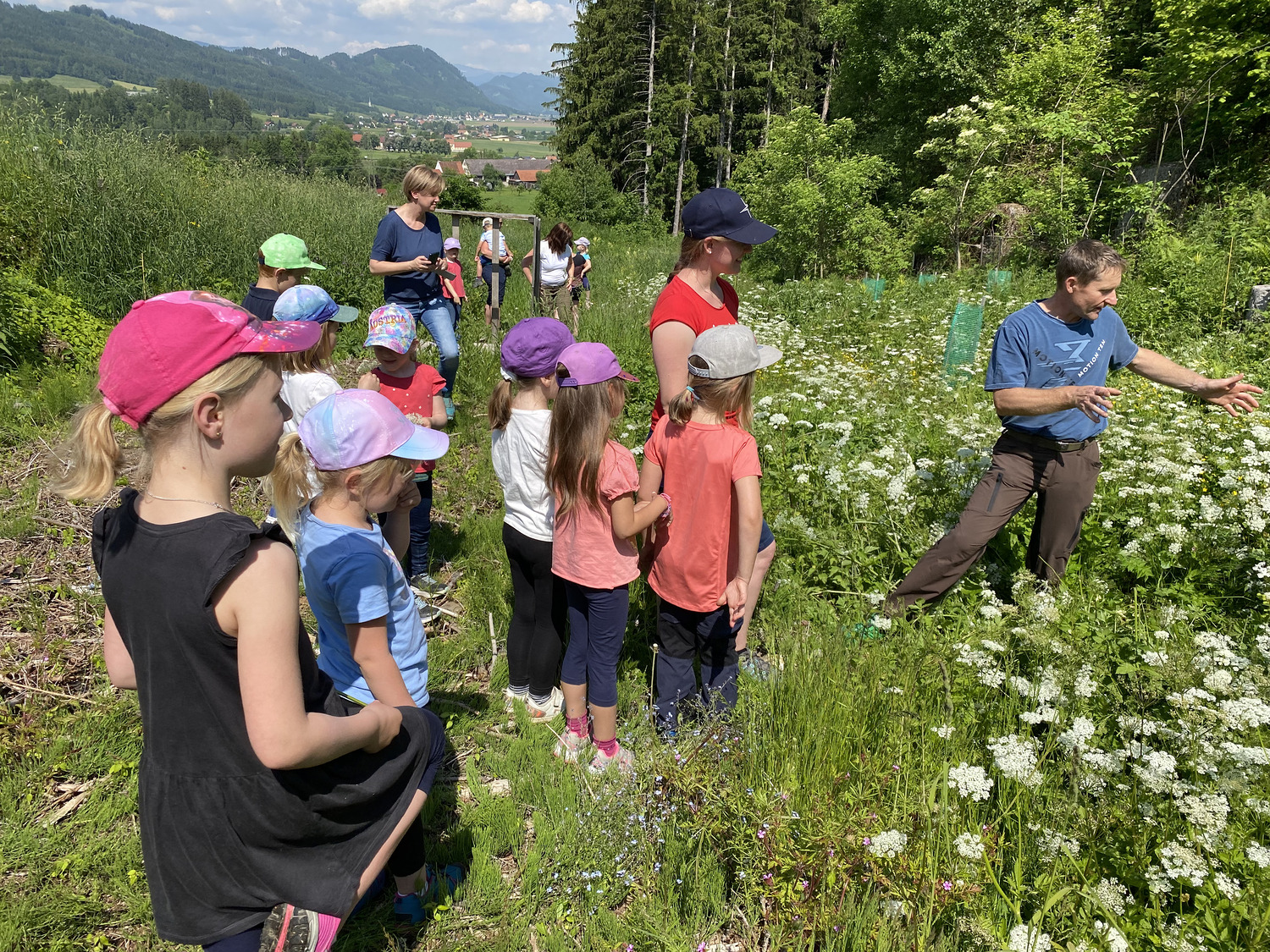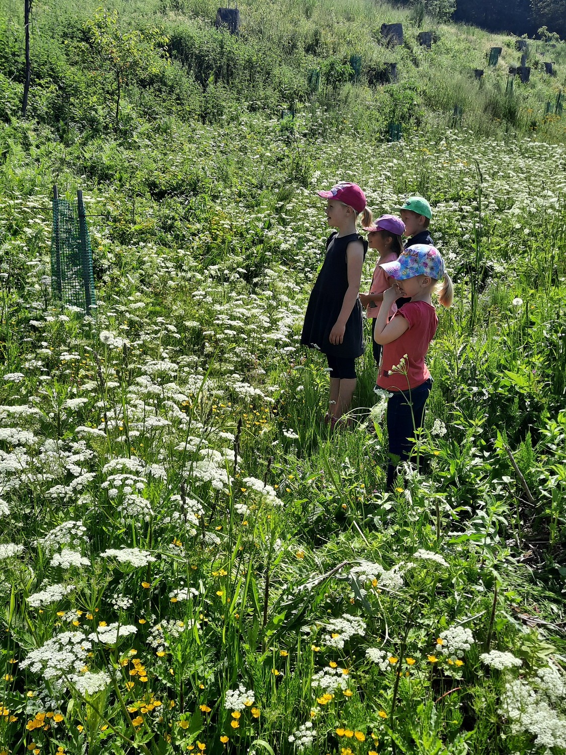 Bei unseren Bäumchen angekommen entdeckten die Kinder sofort die Tafel, die wir vor einem Jahr an einem Baumstumpf angebracht hatten. Wir mussten feststellen, dass nicht nur unsere Bäumchen etwas gewachsen waren, sondern auch Brennnesseln und Disteln rundherum. Wir erfuhren, dass es sehr viel Arbeit ist, sich um die Bäumchen zu kümmern und dass nicht nur das Einpflanzen dazugehört. Die Bäumchen müssen regelmäßig ausgeschnitten und vor Verbiss geschützt werden, da Wildtiere gerne daran knabbern.