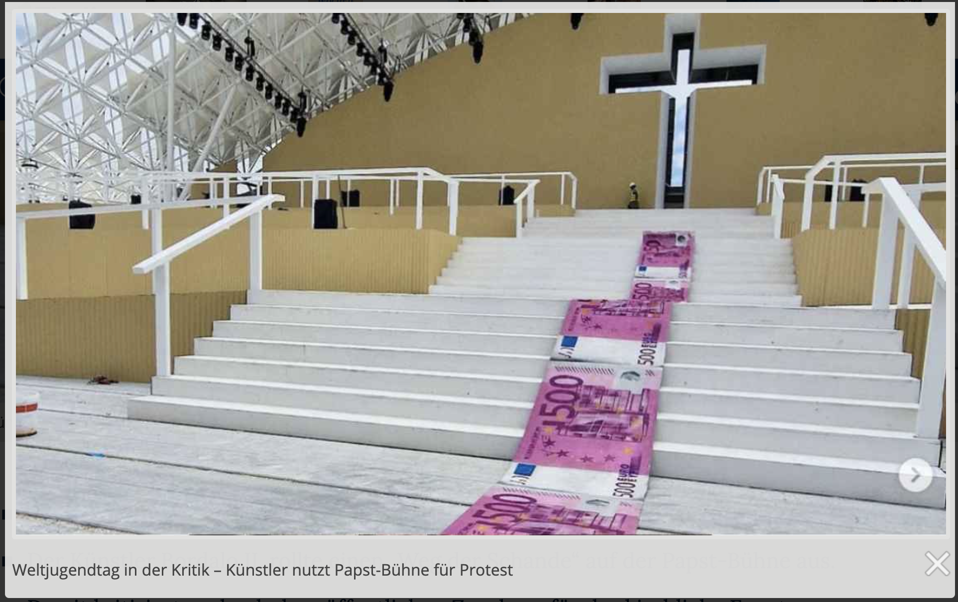 „Weg der Schande“ nannte der portugiesische Straßenkünstler Bordalo II eines seiner neuesten Werke, mit dem er kürzlich für Aufregung sorgte. Er rollte einen langen Teppich aus, mit dem Motiv von 500-Euro-Scheinen bedruckt – auf der sogenannten Papst-Bühne im Tejo-Park in Lissabon.