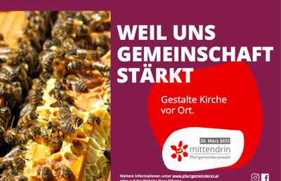 Ich bin da für ein lebendiges und sichtbares Miteinander. In der Pfarre feiern wir gemeinsam im Gottesdienst (Liturgie), wir verkünden einander das Wort Gottes (Verkündigung) und wir unterstützen uns und dienen einander (Diakonie). Als Pfarrgemeinderat oder Pfarrgemeinderätin bin ich mir nicht nur dieses Miteinanders bewusst; ich achte besonders darauf, dass Gemeinschaft spürbar ist und auf vielfältige Art und Weise gelebt werden kann.
