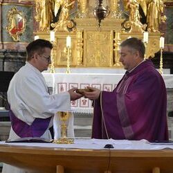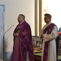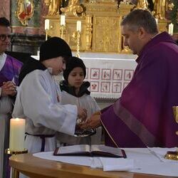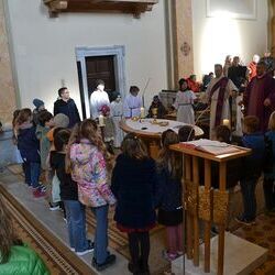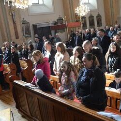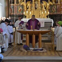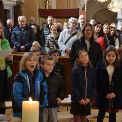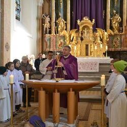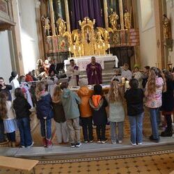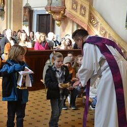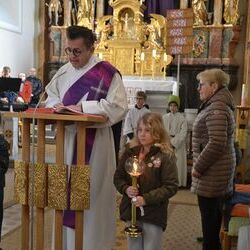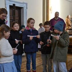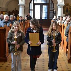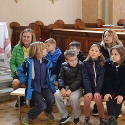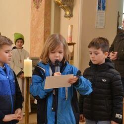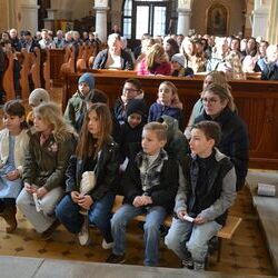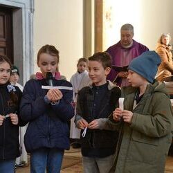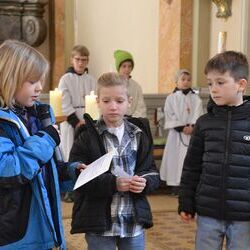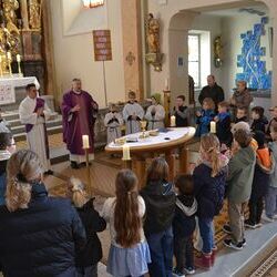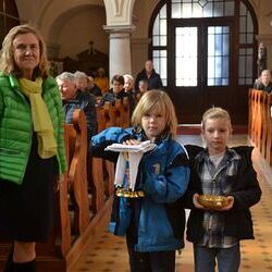 17 Kinder der zweiten Klasse der Volksschulen Wundschuh und Zwaring stellten sich beim Gottesdienst mit Pfarrer Claudiu Budau und Diakon Wolfgang Garber der Pfarrbevölkerung vor.
