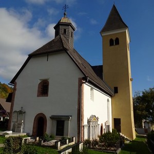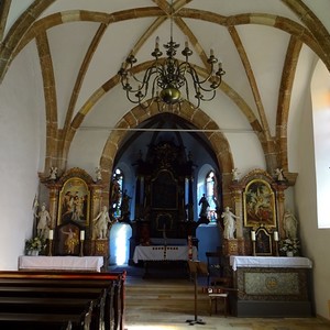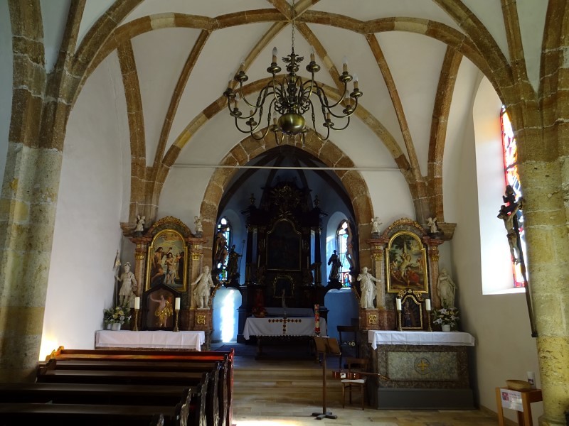 Die ursprünglich romanische Kirche zeigt heute spitzbogige gotische Fenster, ein ebenfalls gotisches Kreuzrippengewölbe im Chorraum und ein 1507 eingefügtes Sternrippengewölbe im Langhaus. Die Fenster des Altarraumes zeigen Darstellungen eines Hackenschmiedes und seiner Frau – diese hier sind Kopien aus dem Jahr 1981, die Originale aus der Zeit um 1400 finden sich im Stadtmuseum Kapfenberg.