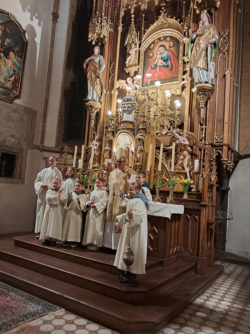 d. Schließlich wird uns das Mahl des Auferstandenen bereitet. Nahrung ist (überlebens-)notwendig. Hier in dieser Stadt, in den Pfarren im Seelsorgeraum, noch immer sehr oft in heiligen Messen mit Eucharistie - vor allem im Vergleich mit anderen Weltgegenden. - Wenn wir Ostern mit der Eucharistie feiern, dürfen wir uns eingeladen wissen, die Sakramente der Kirche als Instrumente ernst- und anzunehmen, die es uns ermöglichen, einer oft hoffnungslos sich gebärdenden Welt entgegenzutreten im Brustton der Überzeugung, dass es immer Zukunft gibt. Ja, unser Glaube ist ein Mutmacher, den wir nicht zu unterschätzen brauchen.