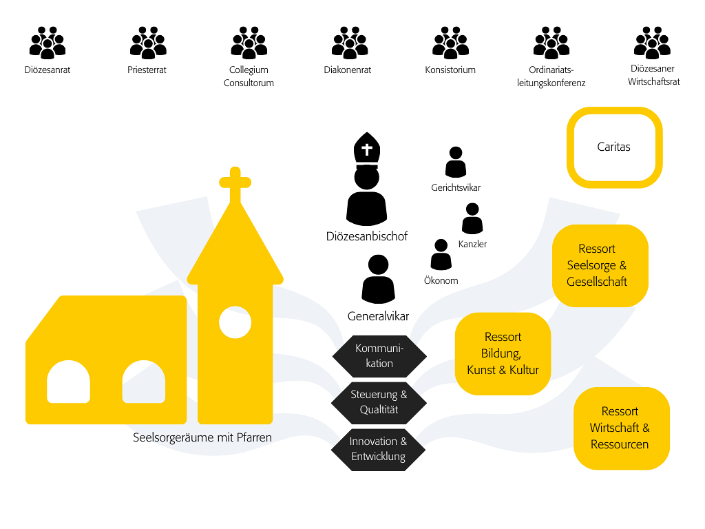 Die Abteilungen und Einrichtungen sind im Ordinariat in den Ressorts Seelsorge & Gesellschaft, Bildung, Kunst & Kultur sowie Ressourcen & Verwaltung zusammengefasst. Bestimmte übergreifende Arbeitsabläufe sind fachlich in Prozessbereichen zusammengefasst: Kommunikation, Steuerung & Qualität sowie Innovation & Entwicklung.