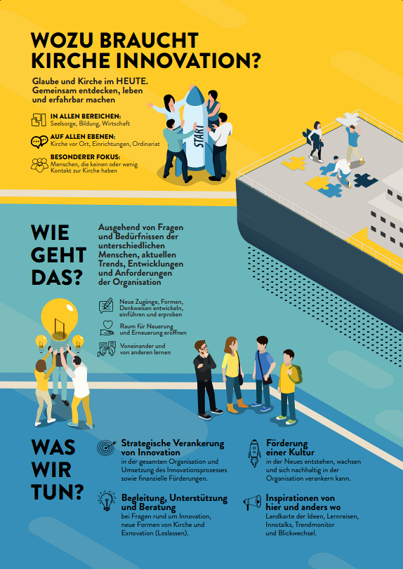 Als Katholische Kirche Steiermark ist uns die Förderung von Innovation ein großes Anliegen. Dem Zukunftsbild entsprechend unterstützen und begleiten wir Ideen mit Zukunftspotential. Wir helfen bei der Entwicklung von neuen Formen und Formaten von Kirche und stellen Gelungenes ins Scheinwerferlicht. Menschen, die auf der Suche nach Neuerung und Erneuerung sind, bringen wir zusammen und suchen nach neuen Ideen und Inspirationen.