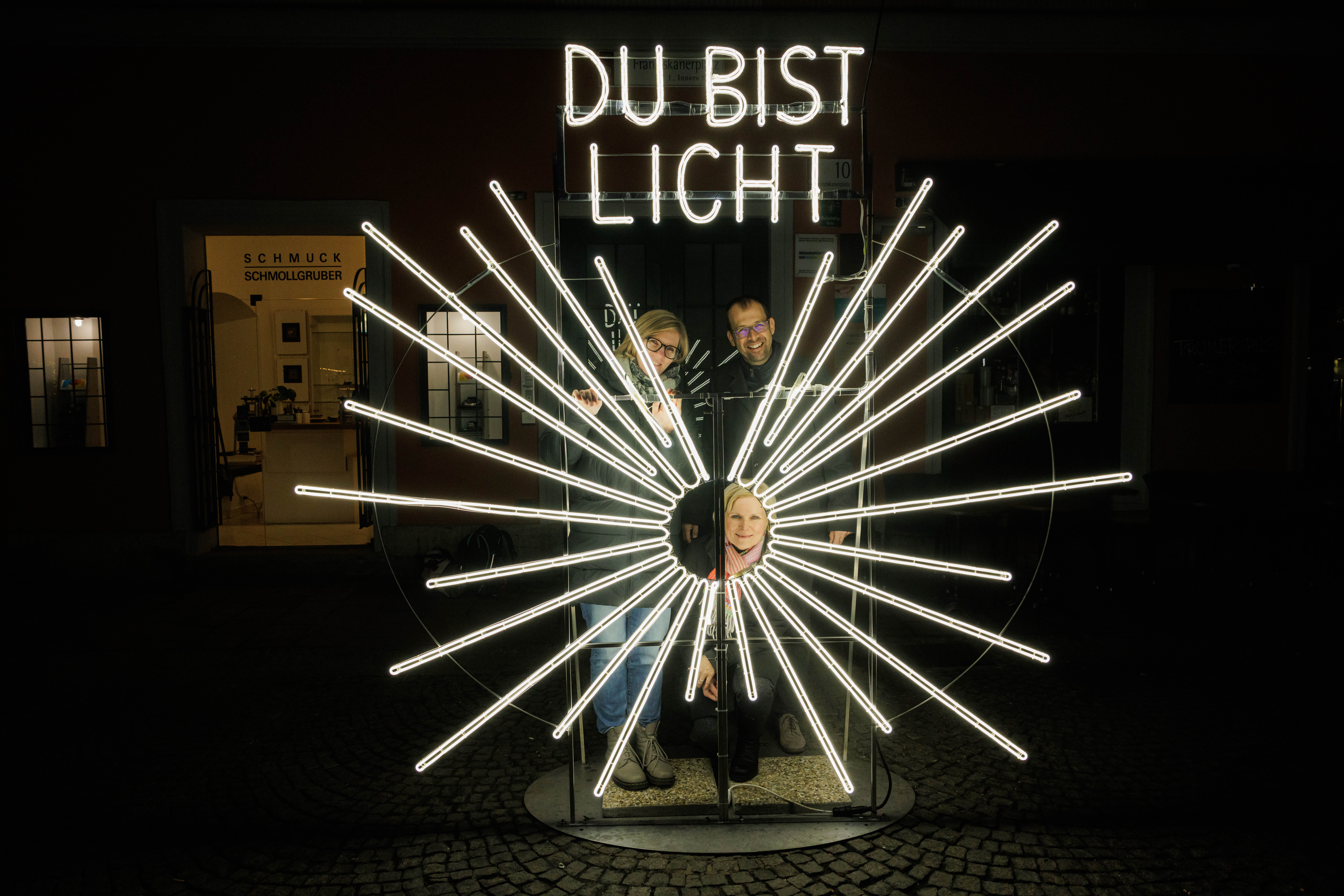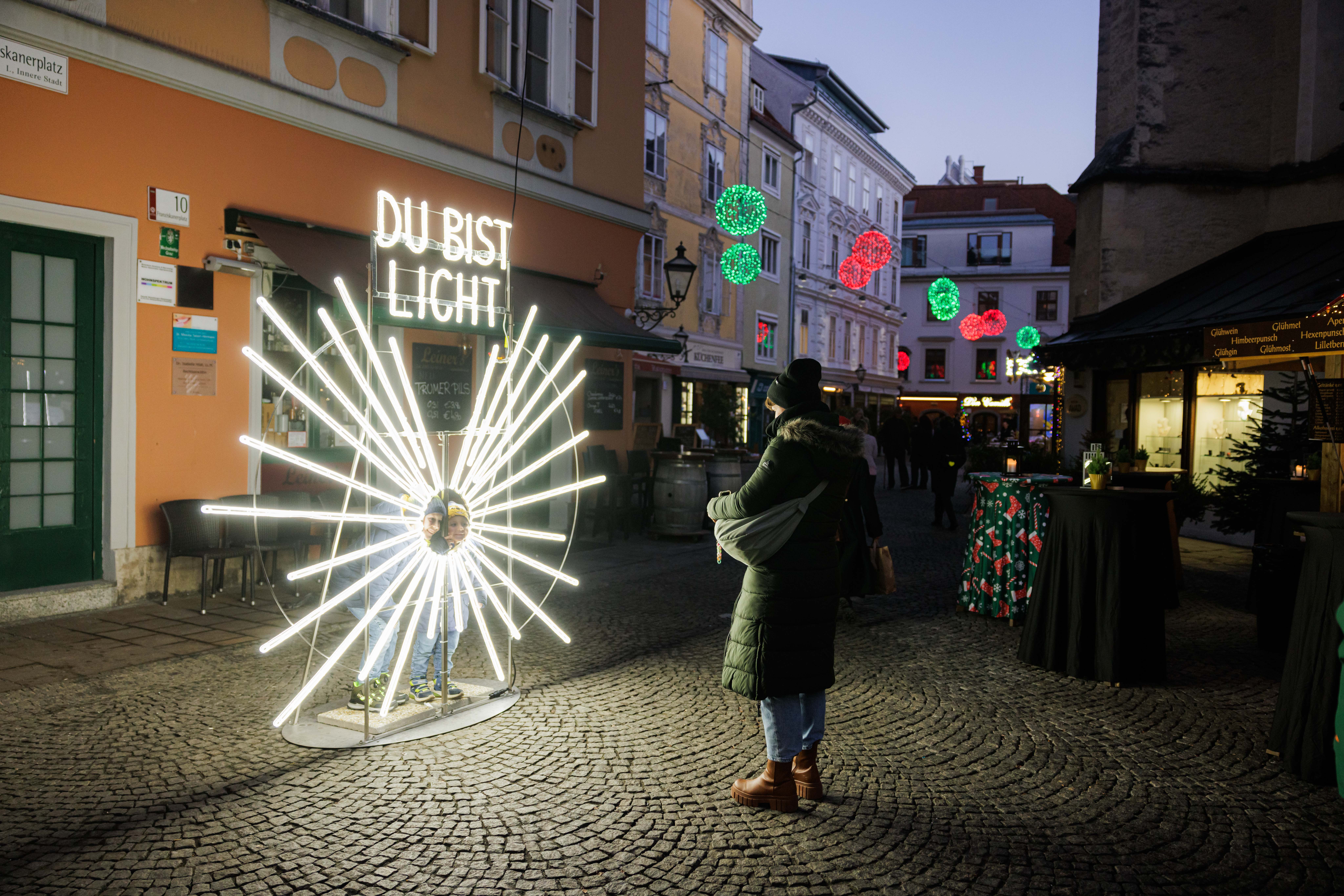 Beim Adventmarkt 2024 am Grazer Franziskanerplatz lädt ein leuchtender Fotopoint alle Menschen ein, sich spielerisch mit einem kirchlichen Thema zu beschäftigen. Ihre je eigene Interpretation der Möglichkeiten spiegelt wider, wie vielfältig Gott uns im heute engegenkommt.