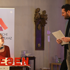 Obwohl der Regen eine Verlegung von der Herrengasse in den Kirchenraum notwendig machte, konnten wir das Event so im Eingangs- und Seitenbereich der Kirche ansiedeln, dass wie geplant auch zufällige Passanten neugierig wurden und den Weg zu uns fanden. Um das Ganze auch optisch aufzupeppen, haben wir bei Art & Event in Messendorf riesige Styropor-Bücher ausgeborgt, die besondere Eye-Catcher bildeten.Der absolute Aha-Effekt aber war zu erleben, wie gut es ist, einmal nicht selbst Texte vorzugeben, sondern die Mitwirkenden zu bitten, ihre eigenen Lieblingsgeschichten mitzubringen. Denn zum einen haben die Vorlesenden ganz besondere Texte ausgesucht, die die anderen noch nie gehört hatten. Und zum anderen haben sie auch erzählt, warum diese Texte für sie und ihr Leben wichtig sind, was sehr persönliche Einblicke und Gespräche ermöglichte.