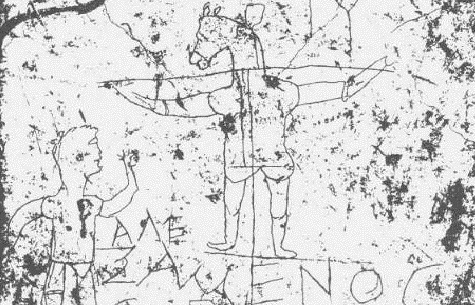 Die älteste uns erhaltene Darstellung des Gekreuzigten ist kein frommes Andachtsbild, sondern eine Karikatur aus der Zeit der Christenverfolgung: Eine Wandkritzelei auf dem Palatin in Rom zeigt den Gekreuzigten mit Eselskopf, davor einen Beter, darunter die spöttischen Worte: "Alexamenos betet seinen Gott an".