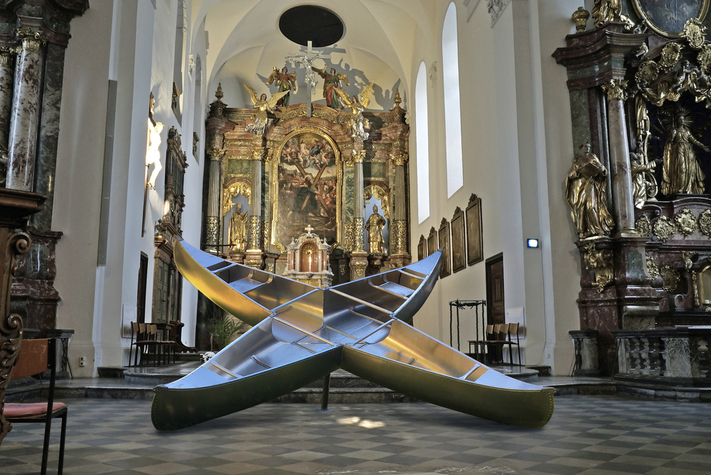 Der harte Migrationskurs Europas ist in Lackners Objekt „Kreuzfahrt“ in eine Skulptur gegossen: Das große Kreuz in Form zweier gekreuzter Boote macht die Ausweglosigkeit derer sichtbar, die dieses Boot benutzen wollen.