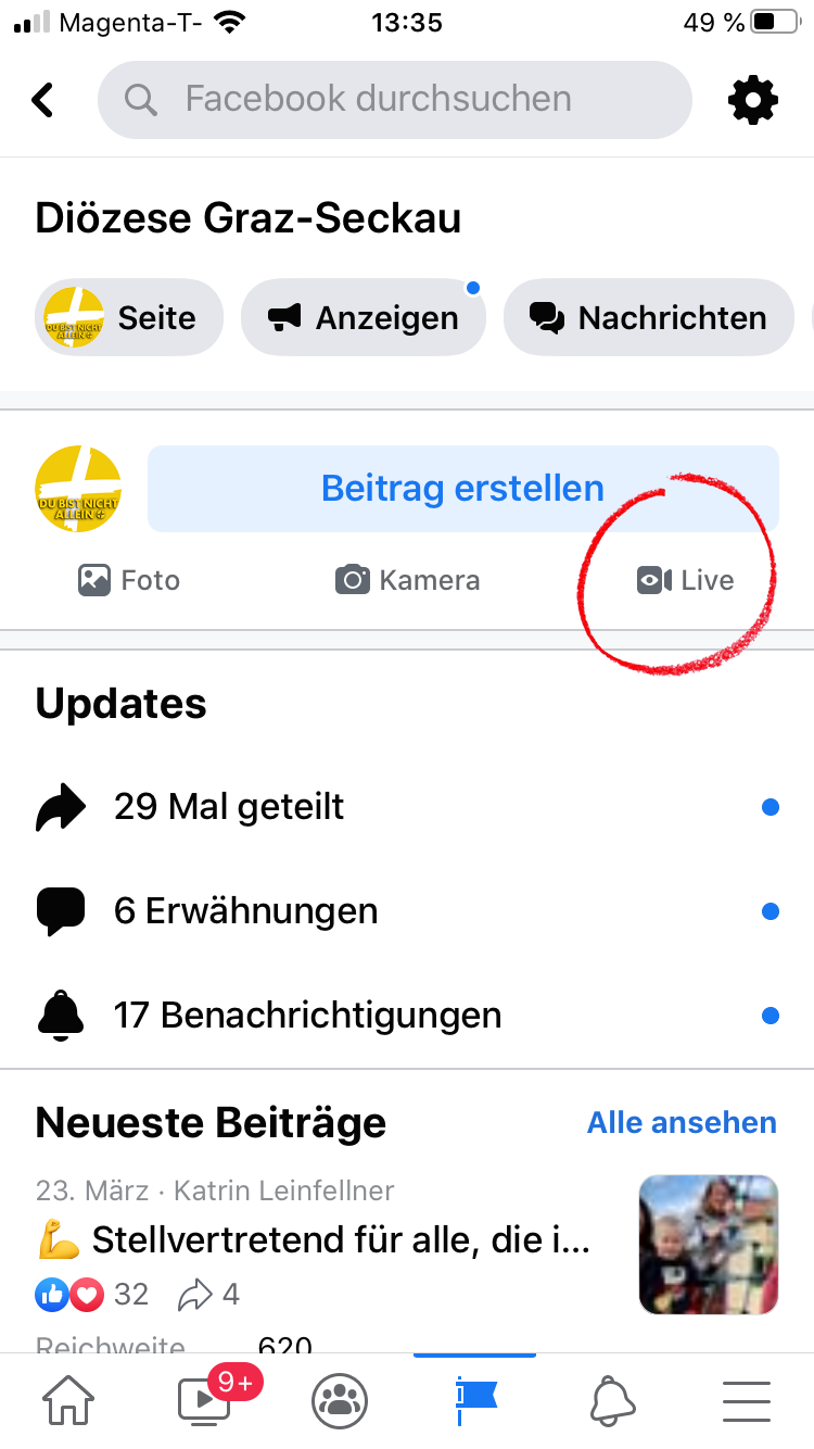 Öffnen Sie die Facebook-App auf Ihrem Handy oder Tablet. Wenn Sie eine Facebook-Seite einer Pfarre oder Einrichtung betreiben, navigieren Sie zu dieser über das "Fähnchen"-Symbol im unteren Menü.