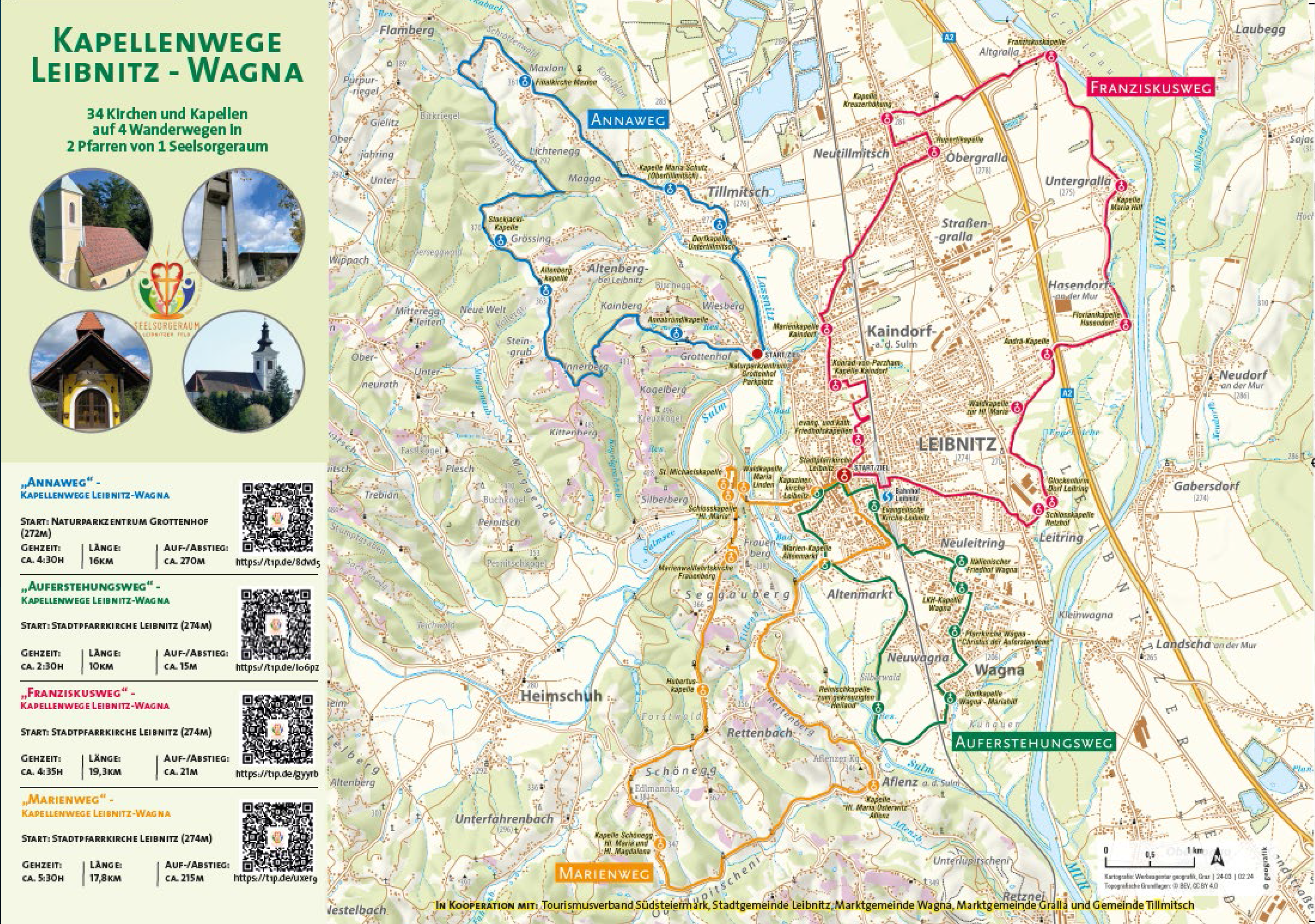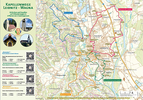 Seit rund einem dreiviertel Jahr arbeitet eine Arbeitsgruppe der beiden Pfarren an der Konzeption und Umsetzung des Wanderwegeprojektes „Kapellenwege Leibnitz – Wagna“, das die Erschließung aller weit mehr als Kapellen und Kirchen in beiden Pfarren im Rahmen der vier Rundwanderwege zum Ziel hat. Jeder Weg wurde nach einer Kapelle bzw. Kirche auf dem Weg benannt.
