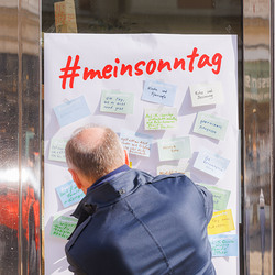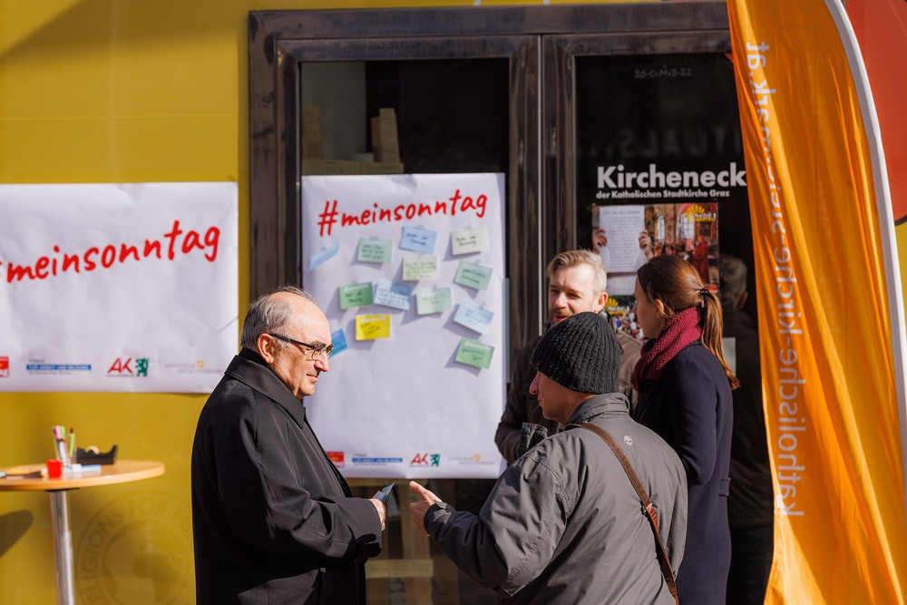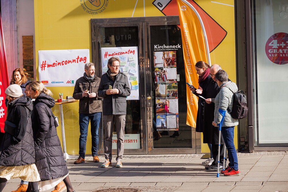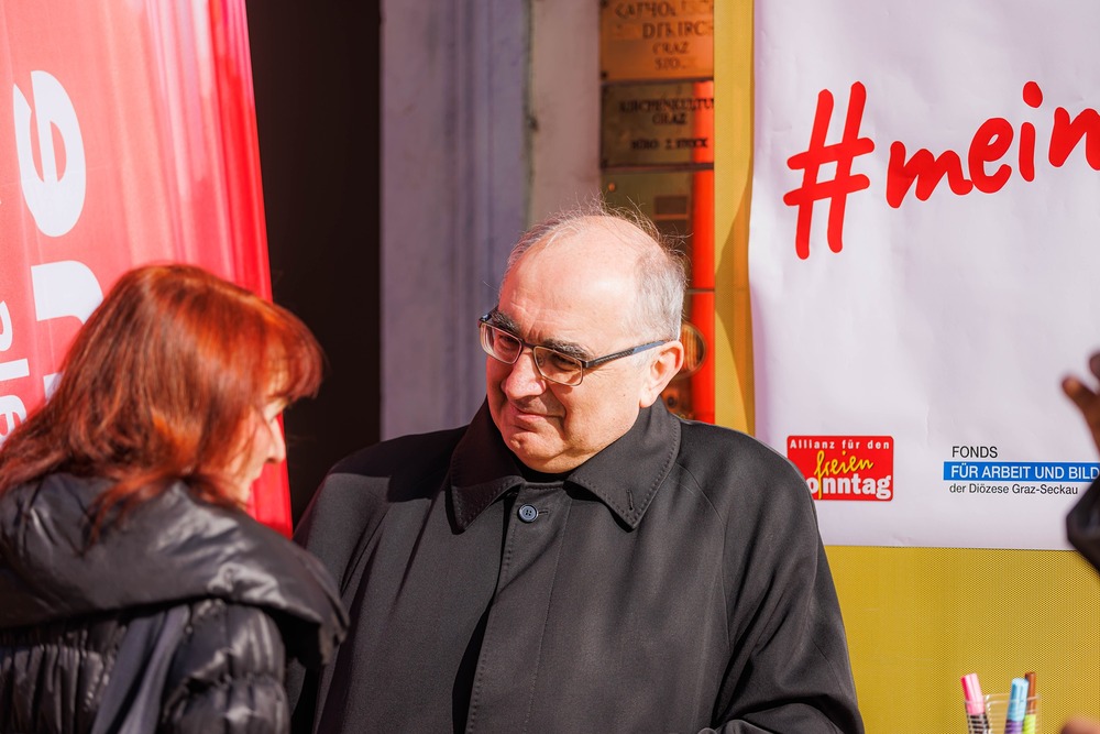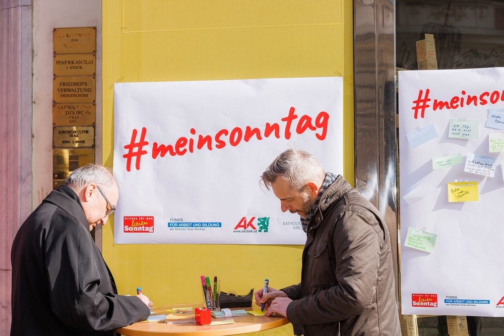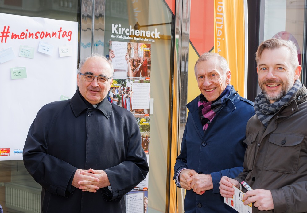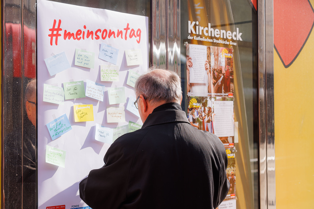 Bischof Wilhelm Krautwaschl, der Fonds für Arbeit und Bildung mit Geschäftsführer Bernhard Schwarzenegger, sowie die Arbeiterkammer Steiermark mit Präsident Josef Pesserl haben anlässlich des internationalen Tages des Arbeitsfreien Sonntags Passant:innen in der Grazer Herrengasse befragt, was ihnen am Sonntag wichtig ist. Die Antworten wurden auf Kärtchen notiert und sichtbar gemacht: ... .... allen war der Sonntag wichtig: "Zeit für Familie", das "Abschalten" wurden mehrfach genannt.