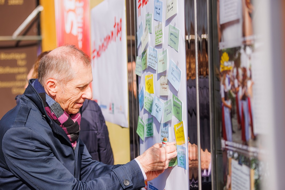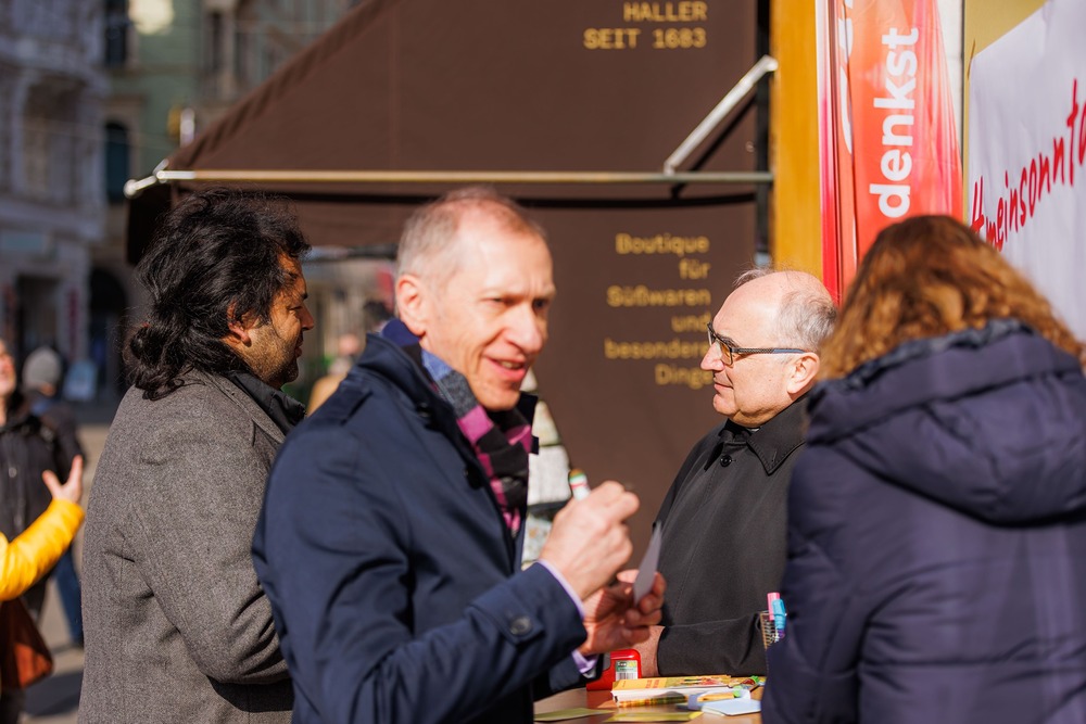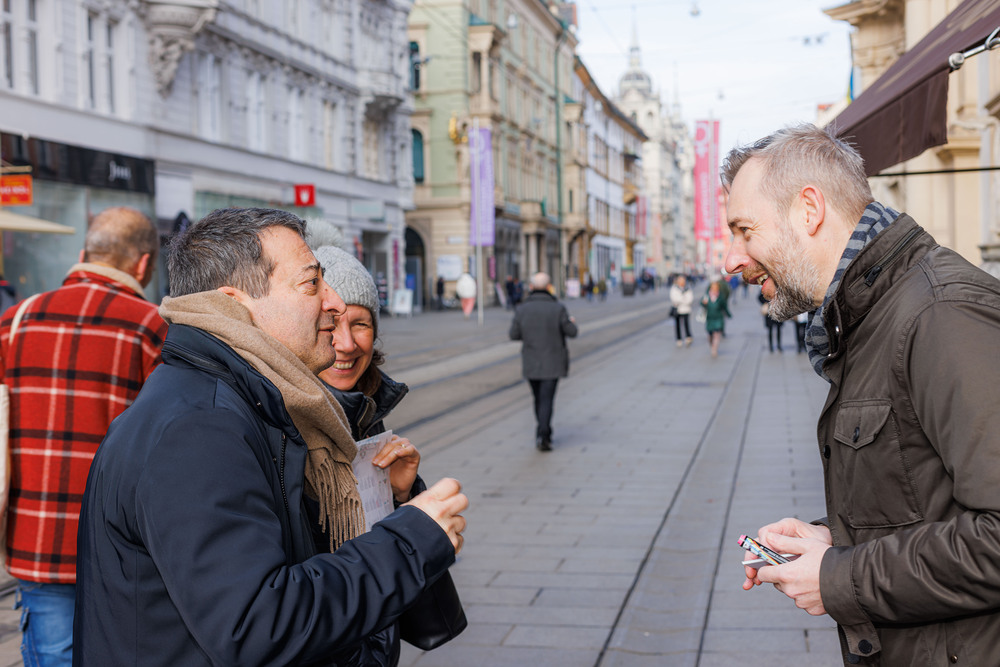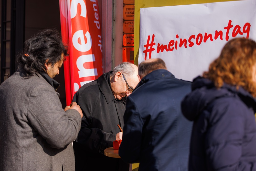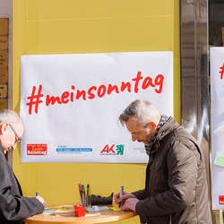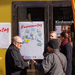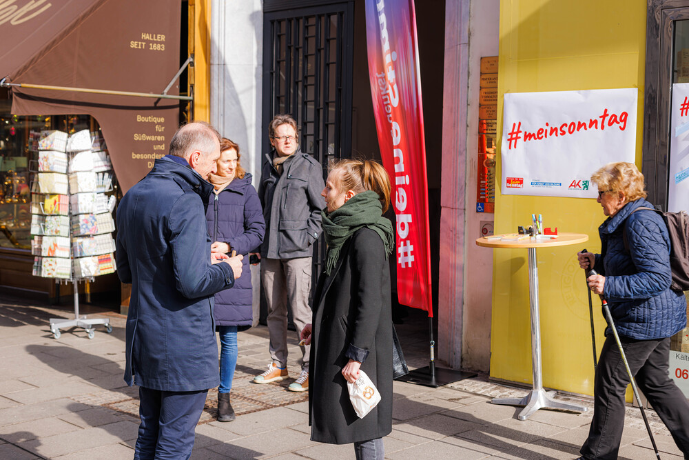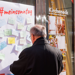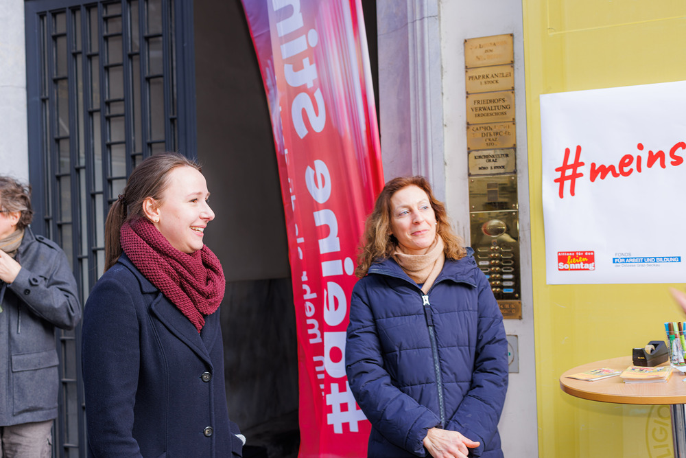 Bischof Wilhelm Krautwaschl, der Fonds für Arbeit und Bildung mit Geschäftsführer Bernhard Schwarzenegger, sowie die Arbeiterkammer Steiermark mit Präsident Josef Pesserl haben anlässlich des internationalen Tages des Arbeitsfreien Sonntags Passant:innen in der Grazer Herrengasse befragt, was ihnen am Sonntag wichtig ist. Die Antworten wurden auf Kärtchen notiert und sichtbar gemacht: ... .... allen war der Sonntag wichtig: "Zeit für Familie", das "Abschalten" wurden mehrfach genannt.