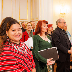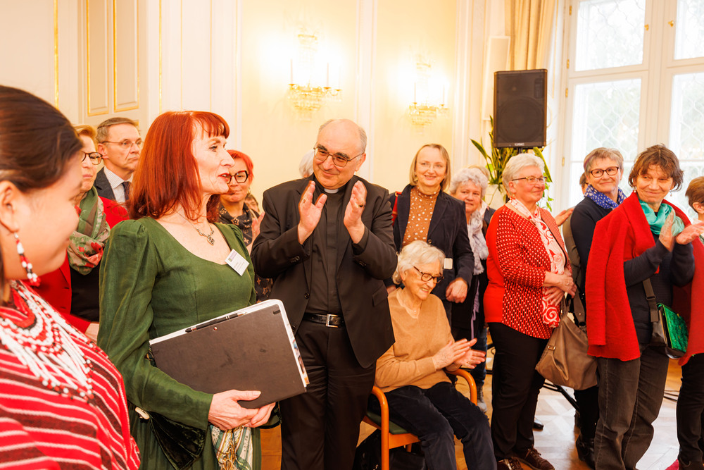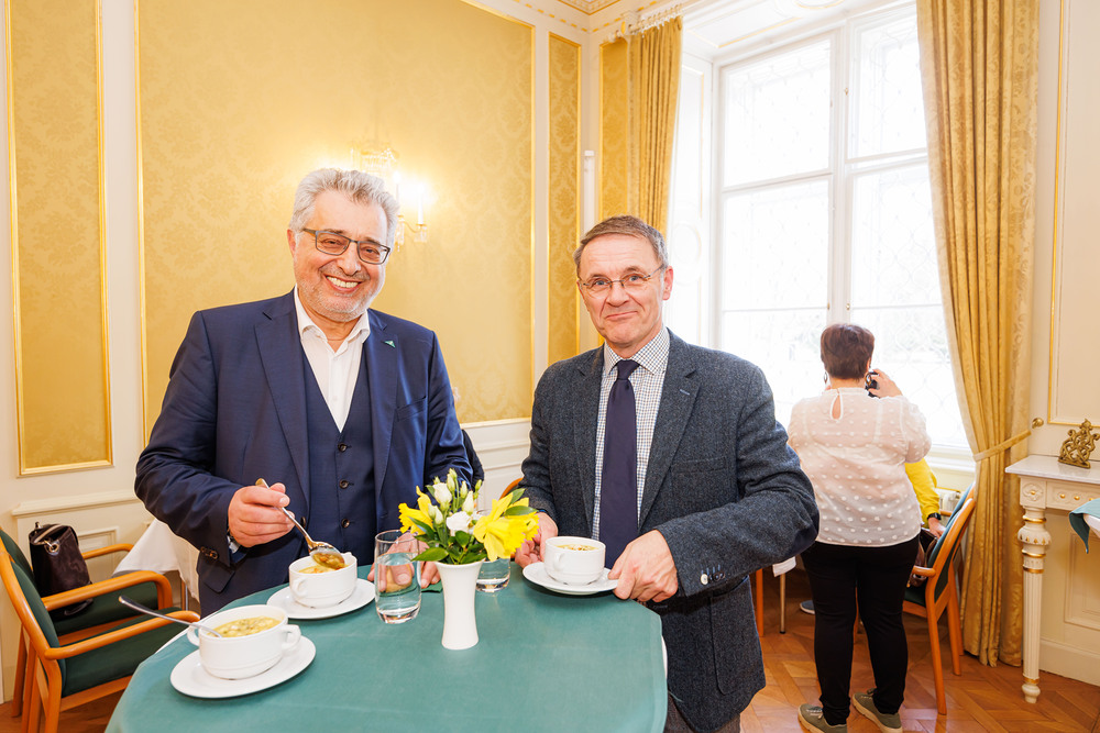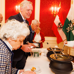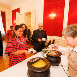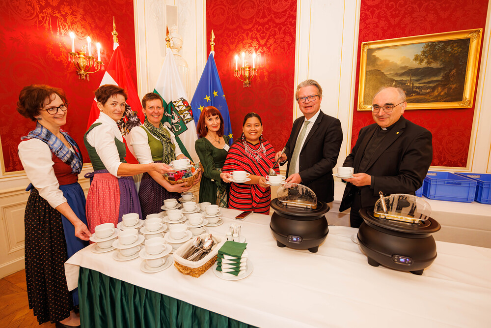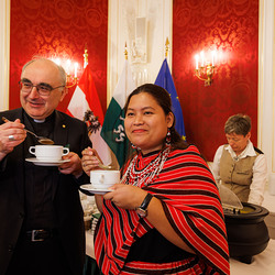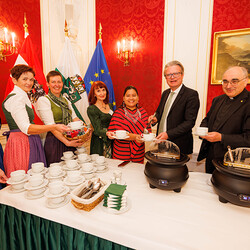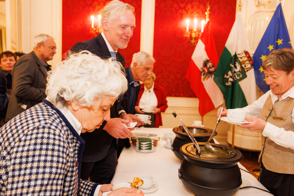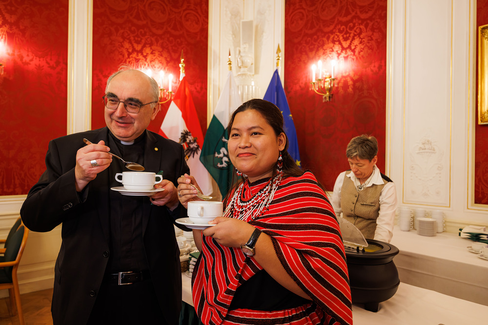 Auf Einladung des Herrn Landeshauptmann Christopher Drexler waren Freundinnen und Freunde der Katholischen Frauenbewegung – unter ihnen Bischof Wilhelm Krautwaschl, Vertreter:innen aus Politik, Wirtschaft, Diözese und zahlreicher Organisationen sowie kfb-Frauen aus allen Regionen der Steiermark – zum traditionellen Suppenessen in den Weißen Saal der Grazer Burg gemeinsam mit Glorie Seno vom heurigen kfb-Schwerpunktprojekt Mindanao Migrants Center MMCEAI auf den Philippinen gekommen.