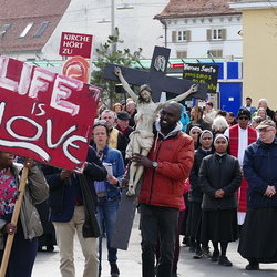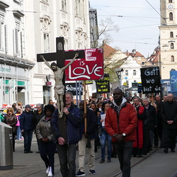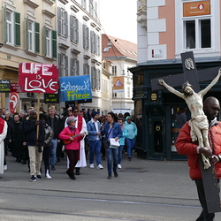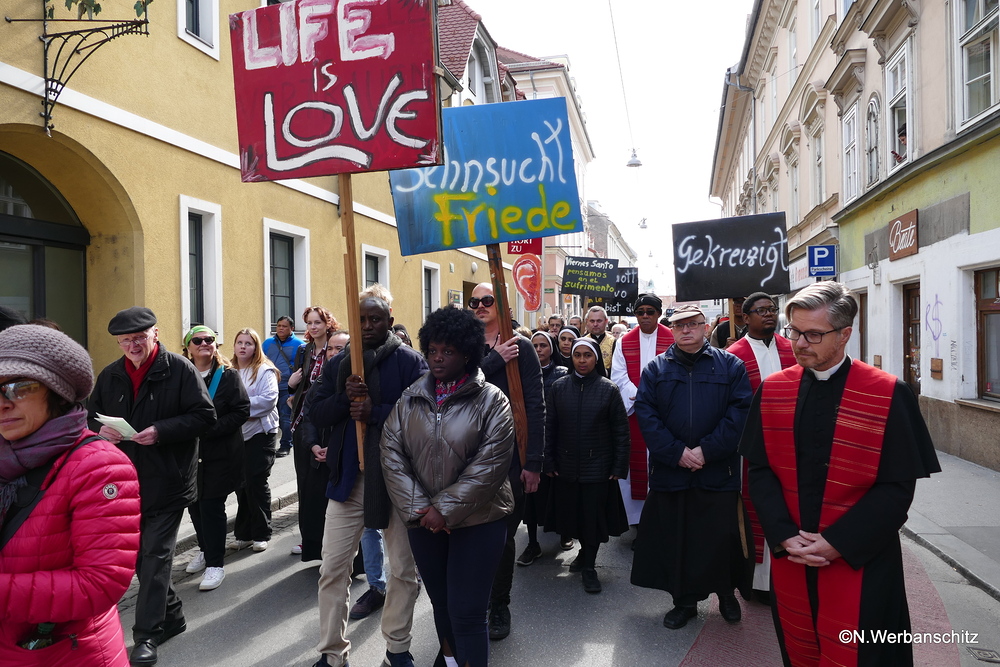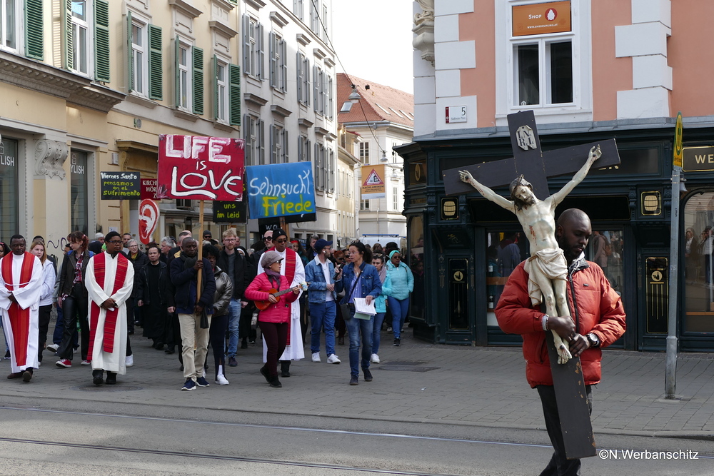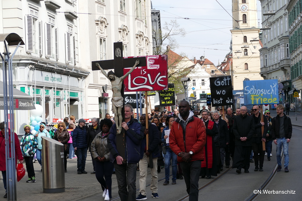 Am Karfreitag fand eine Prozession im Grazer Andräviertel statt. Das Leid und die Not der Kriegs- und Krisengebiete dieser Welt wurde bewusst gemacht. In verschiedenen Sprachen wurde für die Menschen auf der Flucht, die Trauernden, die Kranken, die Einsamen und von Naturkatastrophen Betroffenen und auch für die eigenen Anliegen gebetet.