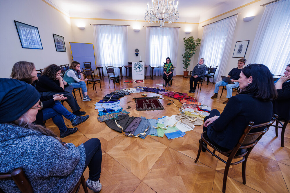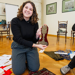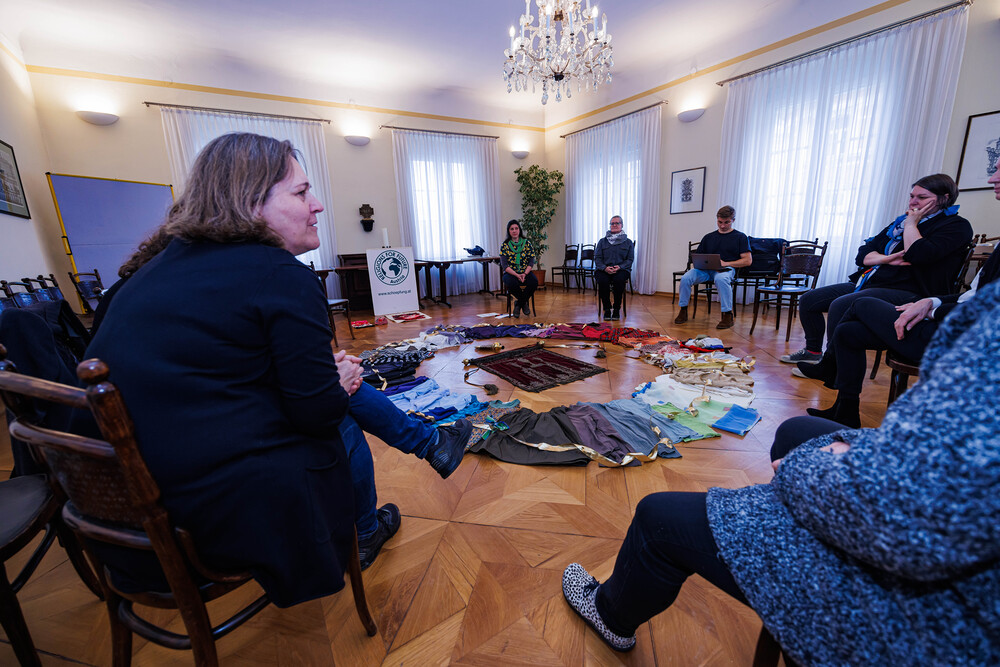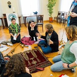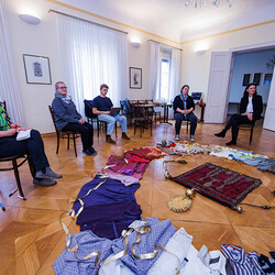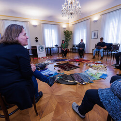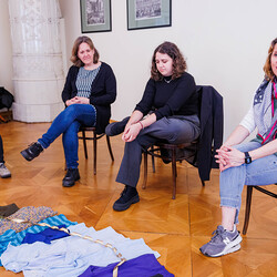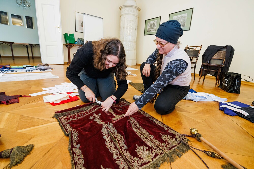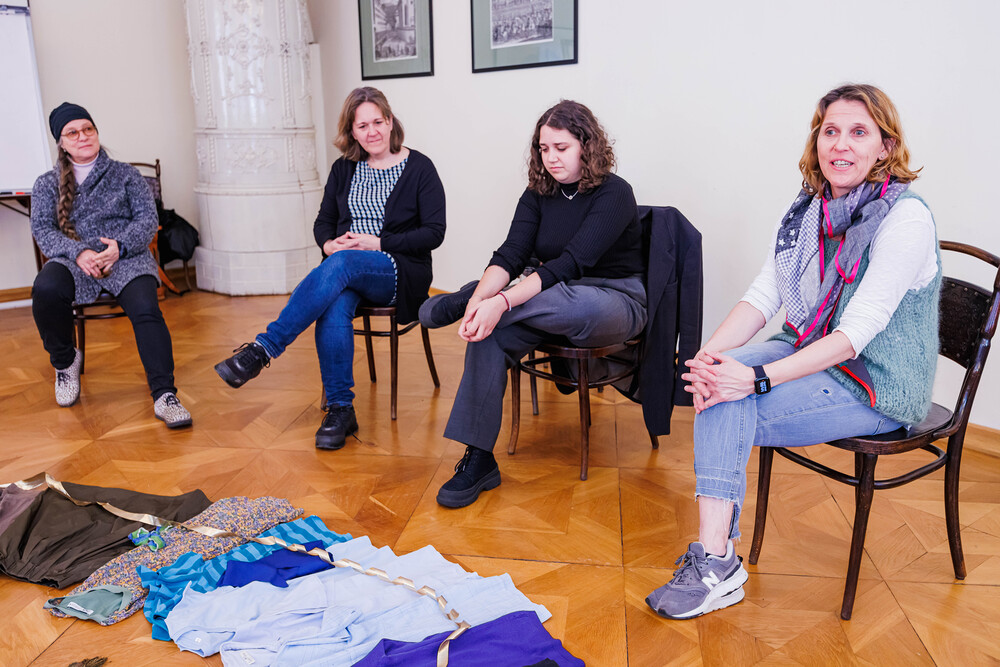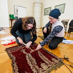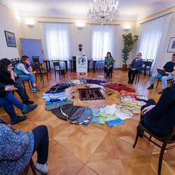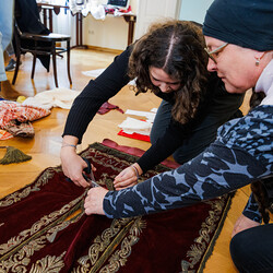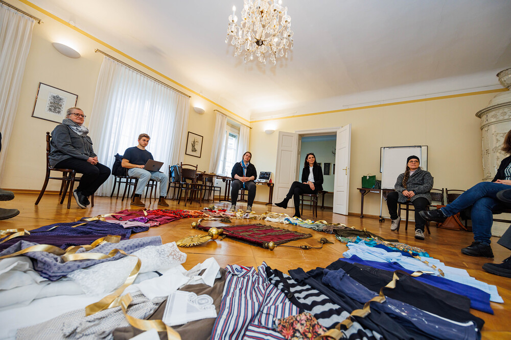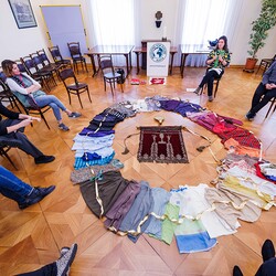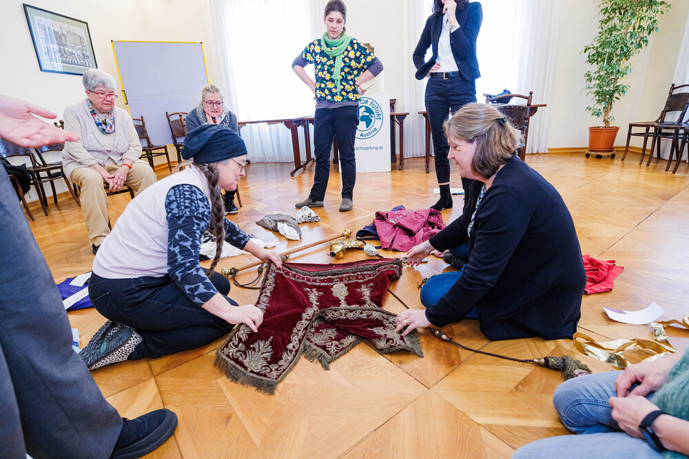 Aus einer alten, im Stoff schon mürb gewordenen Prozessionsfahne aus dem Dachboden der Stadtpfarrkirche zum Heiligen Blut soll eine neuinterpretierte Prozessionsfahne für die heurige Fronleichnamsprozession in Graz genäht werden. Gemeinsam mit der Textilkünstlerin Karin Gollowitsch gab es am 17. Mai 2023 im Stadtpfarrhof in der Herrengasse in Graz einen offenen Workshop, bei dem das neue Design der Fahne von den Teilnehmer:innen erarbeitet wurde. Eingeladen waren alle Interessierten. Mitgebrachte Stoffe, Bänder, Bordüren, etc. wurden bereits vor Ort zu einem neuen Kunstwerk verarbeitet. Dabei konnten die Teilnehmer:innen selber Hand anlegen.